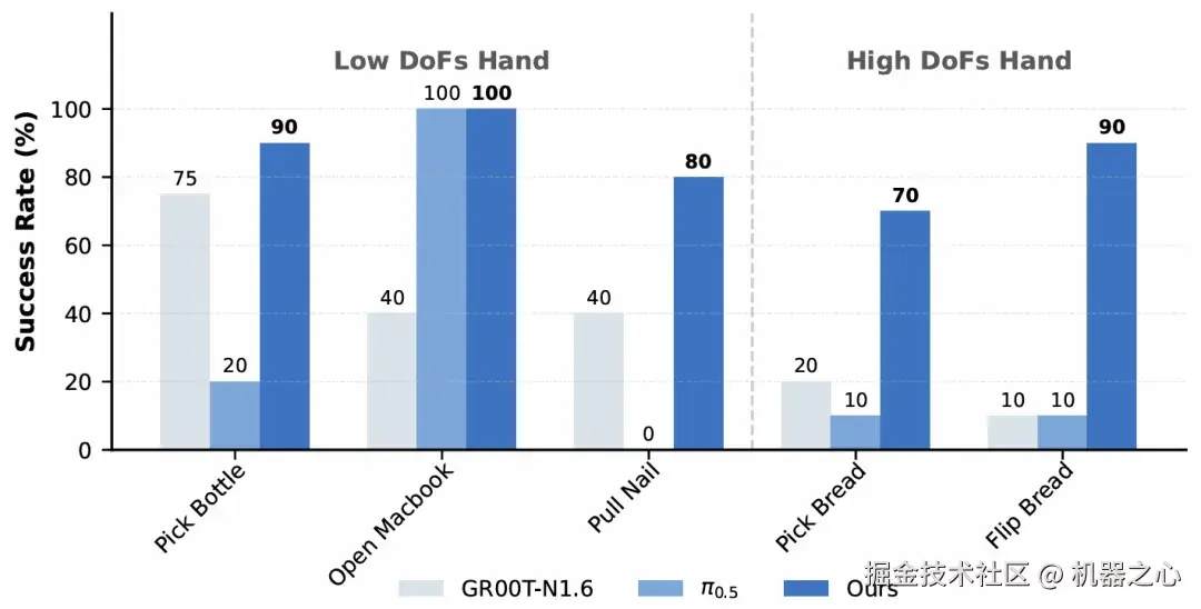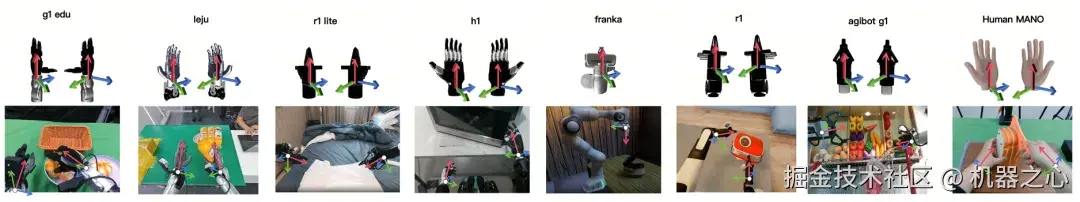 这使得模型不再需要去死记硬背「某台机器人的关节怎么动」,而是将所有动作统一映射到「手如何与物体发生作用」的物理本质上,为跨本体泛化扫清了障碍。