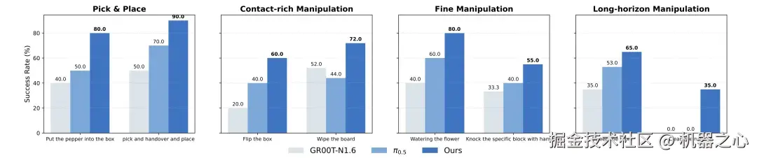 得益于这种结构化隐空间带来的一体化架构,LDA-1B 无论是在任务成功率还是泛化表现上,都以极具说服力的数据,直接秒杀了包括大参数 GR00T 、π 0.5 在内的一众现有模型。
