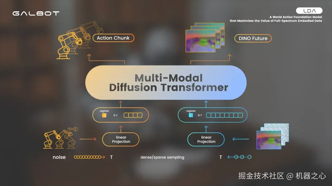 LDA-1B 选择了多模态 Diffusion Transformer(MM-DiT)。它同时处理两条流:动作序列和未来视觉,通过共享注意力机制让两者互相影响。
