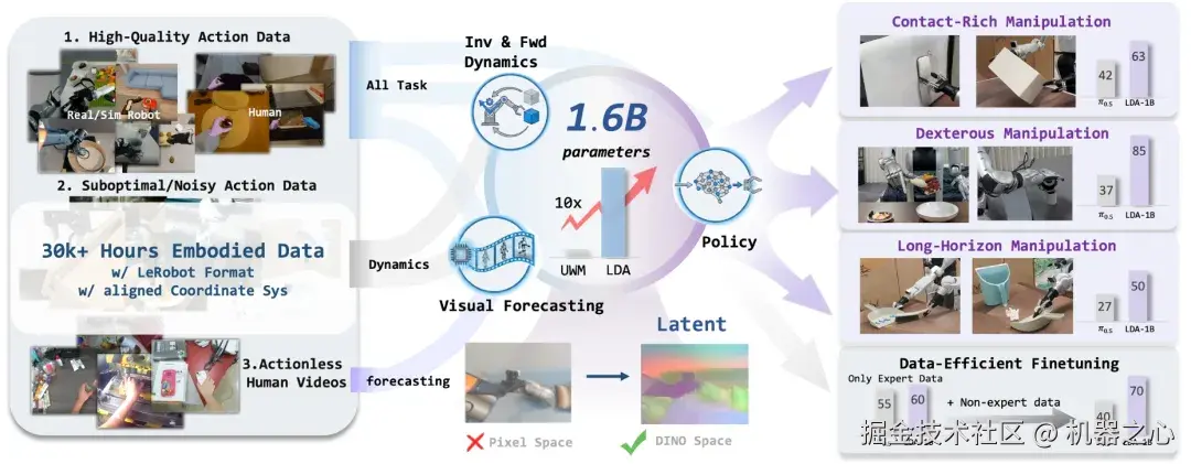 就在这一背景下,银河通用联合清华北大英伟达等众多机构联合发布了跨本体「隐式世界-动作基础模型」LDA-1B,将目光投向了具身智能 Scaling Law 的这个终极命题:如何让模型有效利用互联网规模的异构数据。