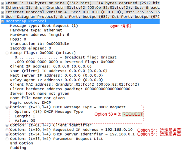 flags广播位=1则广播 - 3 -- DHCPREQUEST :客户端 选择 Offer 时广播通告所有服务器;续租时单播至原服务器
