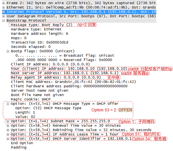 - 2 -- DHCPOFFER :服务器 响应发现请求默认单播 回复客户端;若 DISCOVER 中