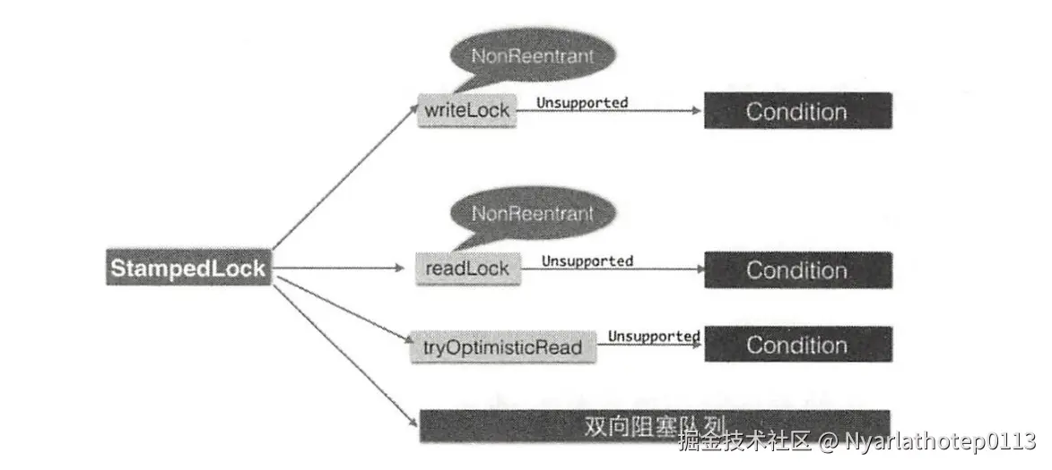 请求该锁成功后会返回一个stamp变量用来表示该锁的版本 ,当释放该锁时需要调用unlockRead方法并传递stamp参数。并且它提供了非阻塞的tryReadLock方法。
