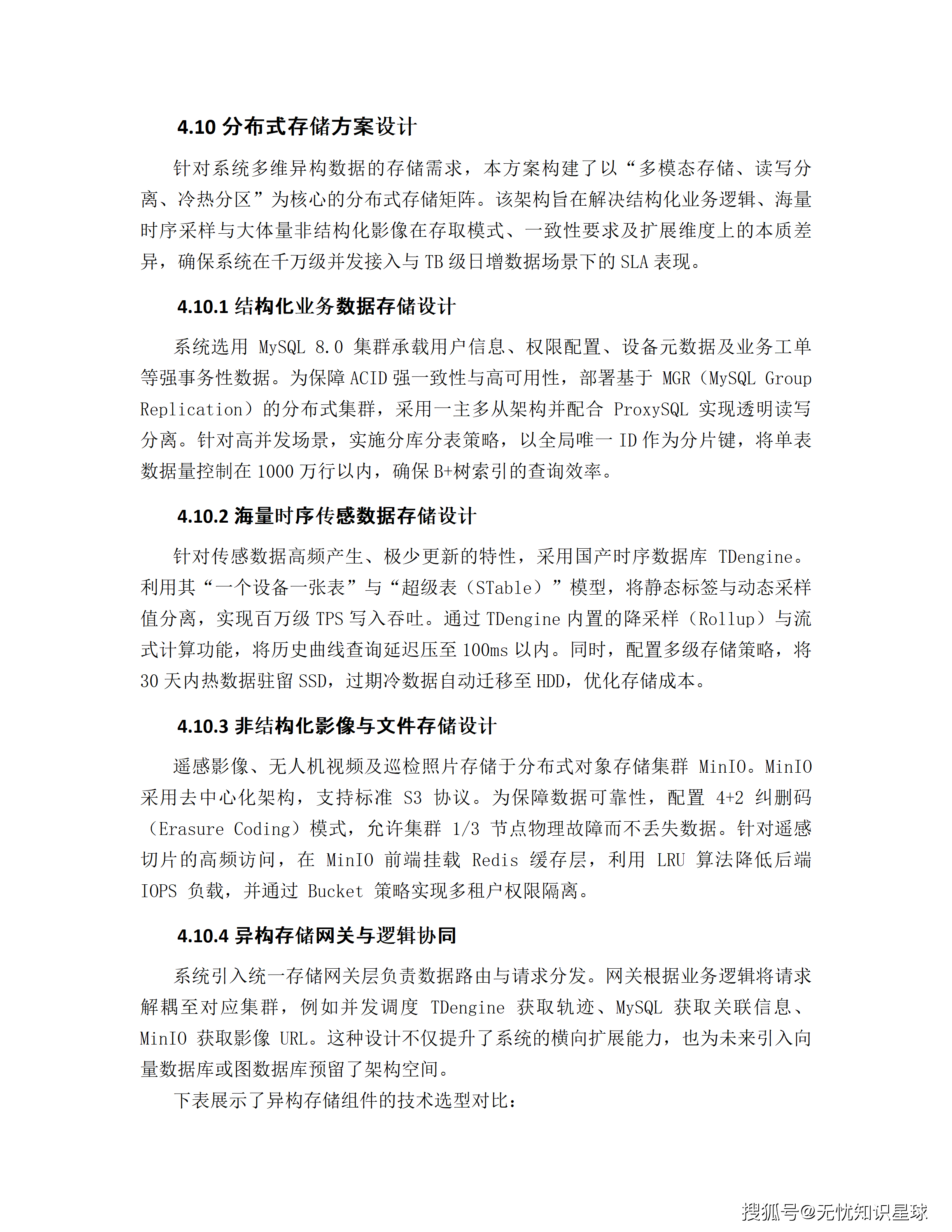 结构化时序数据(环境监测传感器):高频、等间隔、数值型,选型TDengine时序数据库,利用"一设备一表+超级表"的架构支持百万级设备聚合查询,存储空间仅为通用关系型数据库的1/10。