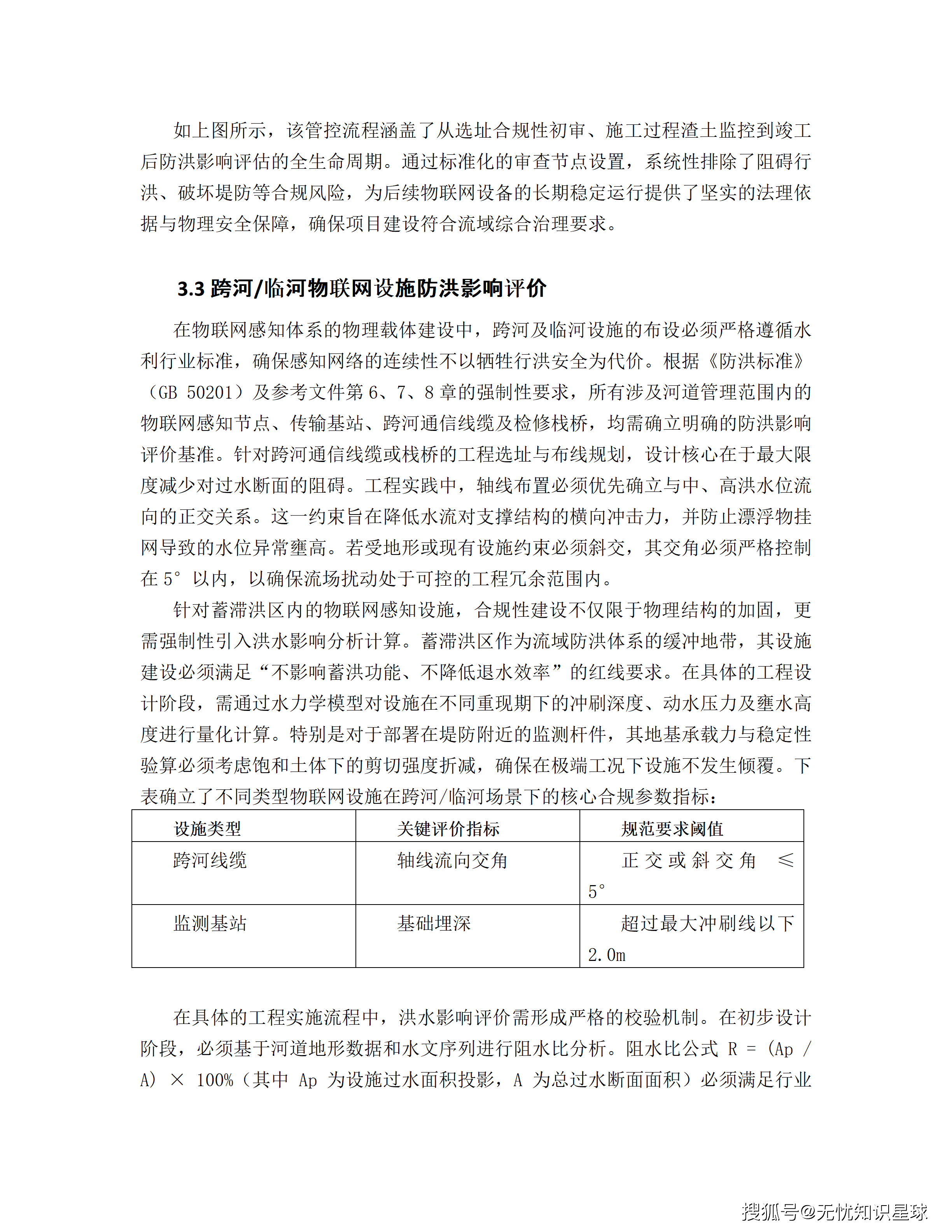 方案确立了"不改变河势、不阻碍行洪、不削弱堤防安全"三大核心合规原则,并在工程实施的多个关键节点建立了法律约束:所有布设在防洪评价范围内的感知终端,选址必须避开河道行洪主槽区及岸坡不稳定地带;跨河通信线缆轴线布置必须优先确立与中、高洪水位流向的正交关系,若必须斜交,交角必须严格控制在5°以内;单体设施阻水率控制在3%以下(通过公式R=(Ap/A)×100%核算)。