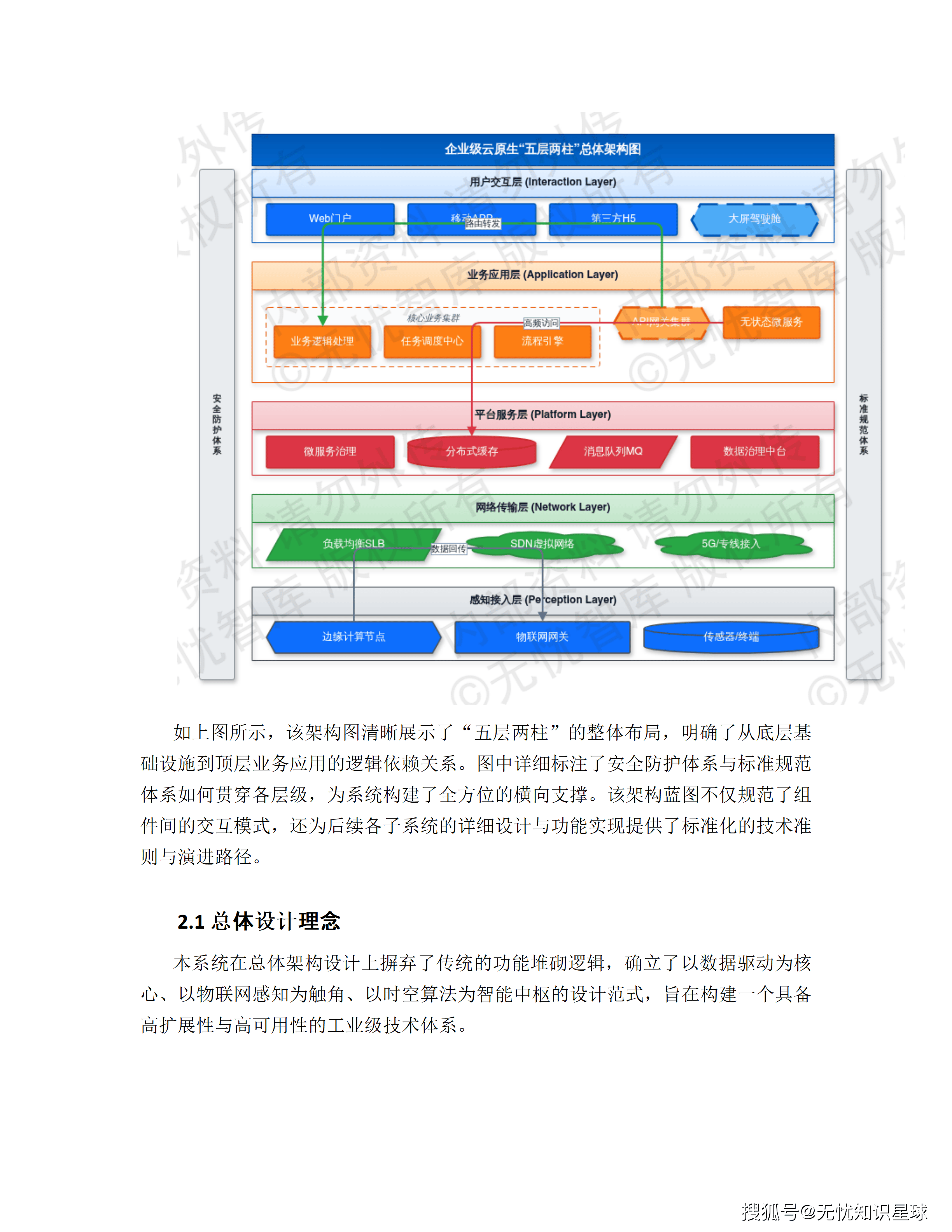 本方案确立了"五层两柱"的系统架构模型:感知接入层、网络传输层、平台服务层、业务应用层、用户交互层纵向堆叠,安全防护体系与标准规范体系横向贯穿。这个模型的表面是技术分层,深层则蕴含了一个重要的工程哲学------业务逻辑与基础设施的解耦。