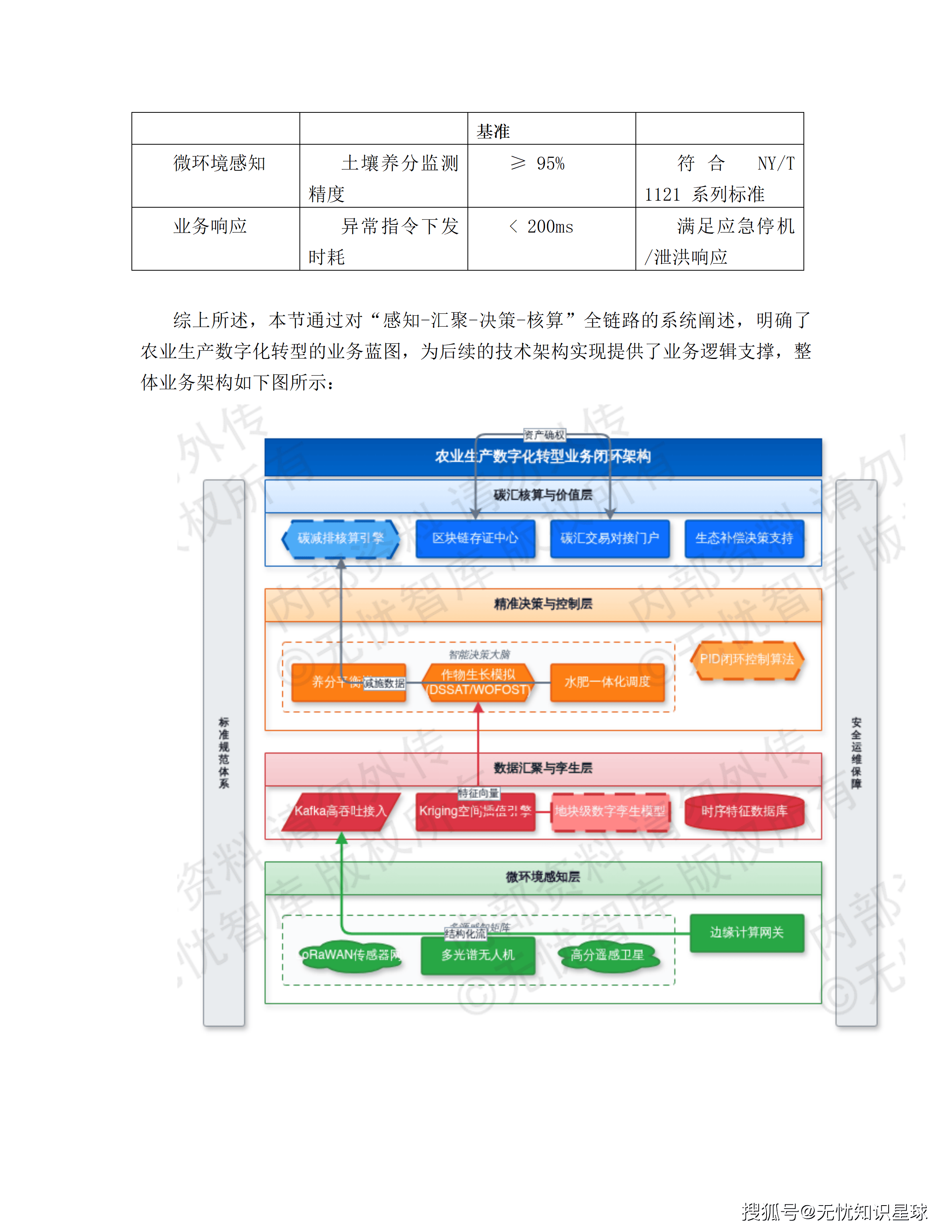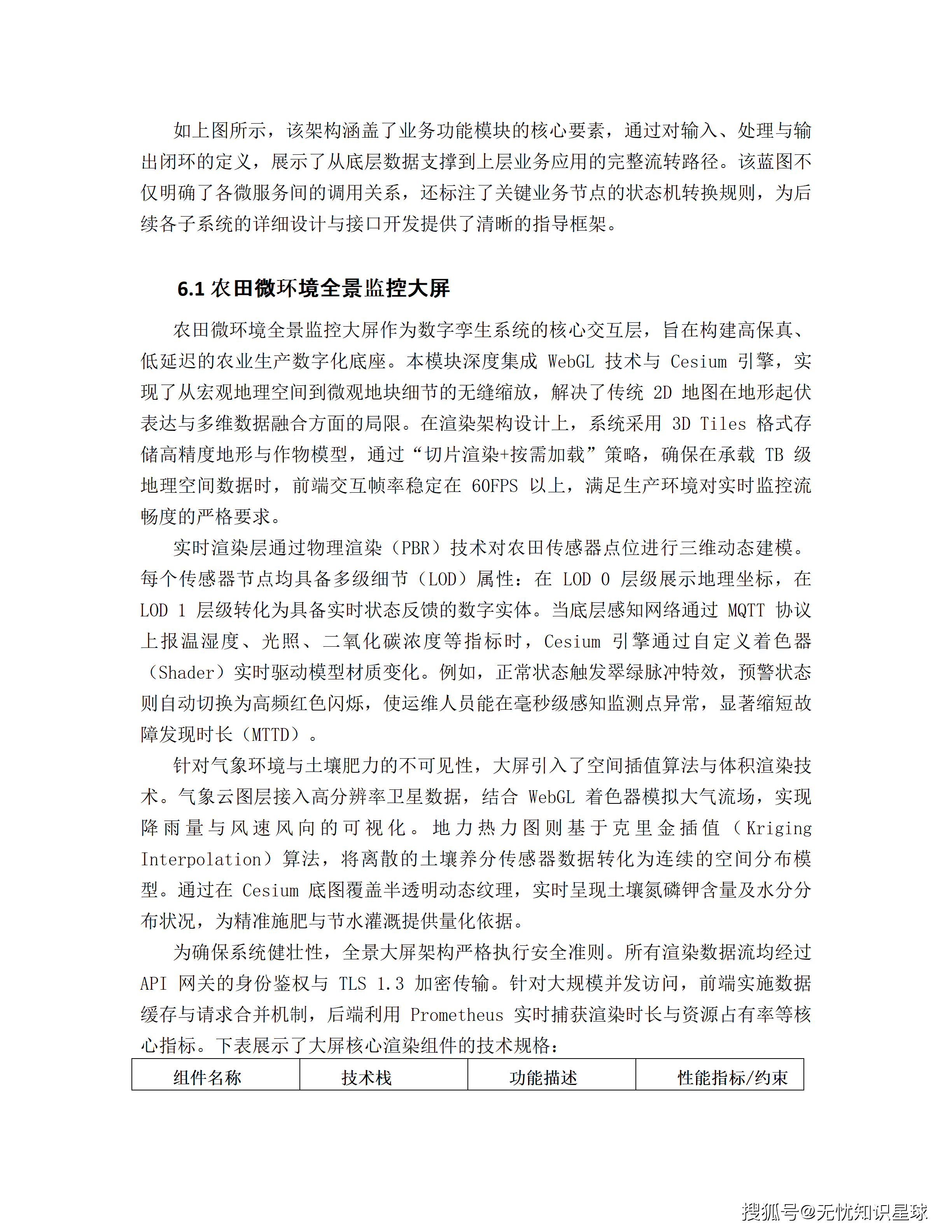 系统在非功能性需求上设定了严苛目标:系统可用性SLA达99.99%,数据处理延迟低于500ms,通过异地多活与自动化故障转移机制实现。这些指标并非"面子工程",而是支撑精准农业决策实时性的刚性约束------当土壤含水量触发异常告警时,灌溉指令的下发延迟直接决定了作物的胁迫程度。