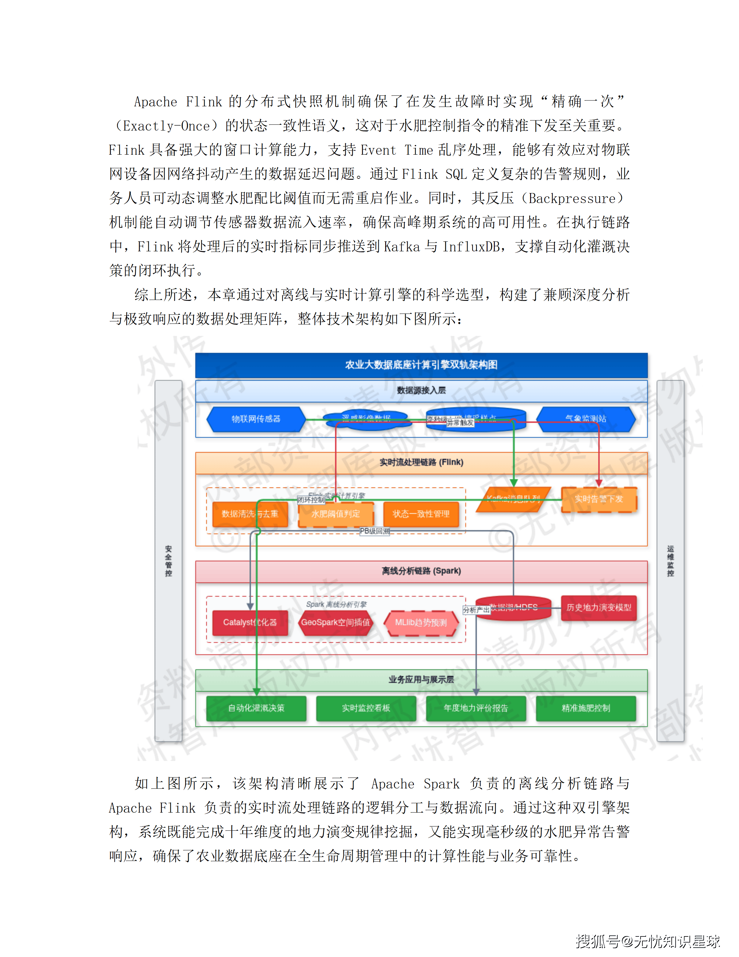 双引擎协作的关键在于数据流的衔接:Flink实时处理结果同步推送到Kafka与InfluxDB,既支撑自动化灌溉决策的闭环执行,也作为Spark离线分析的输入数据源。这种实时与批量的数据血缘关系,保证了决策逻辑在时间维度上的一致性。