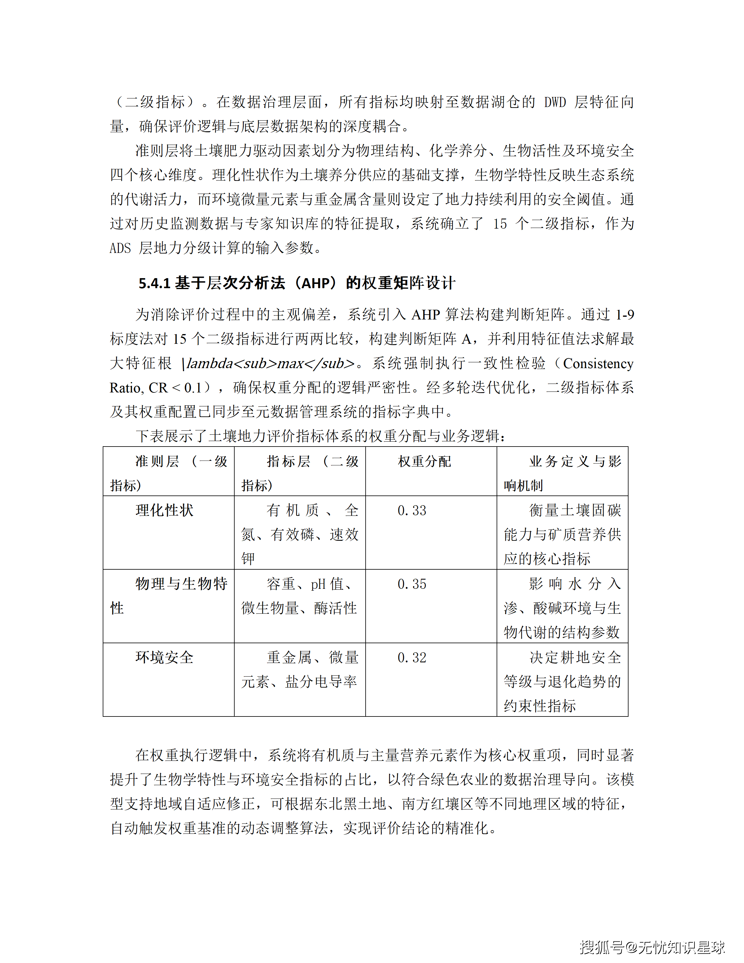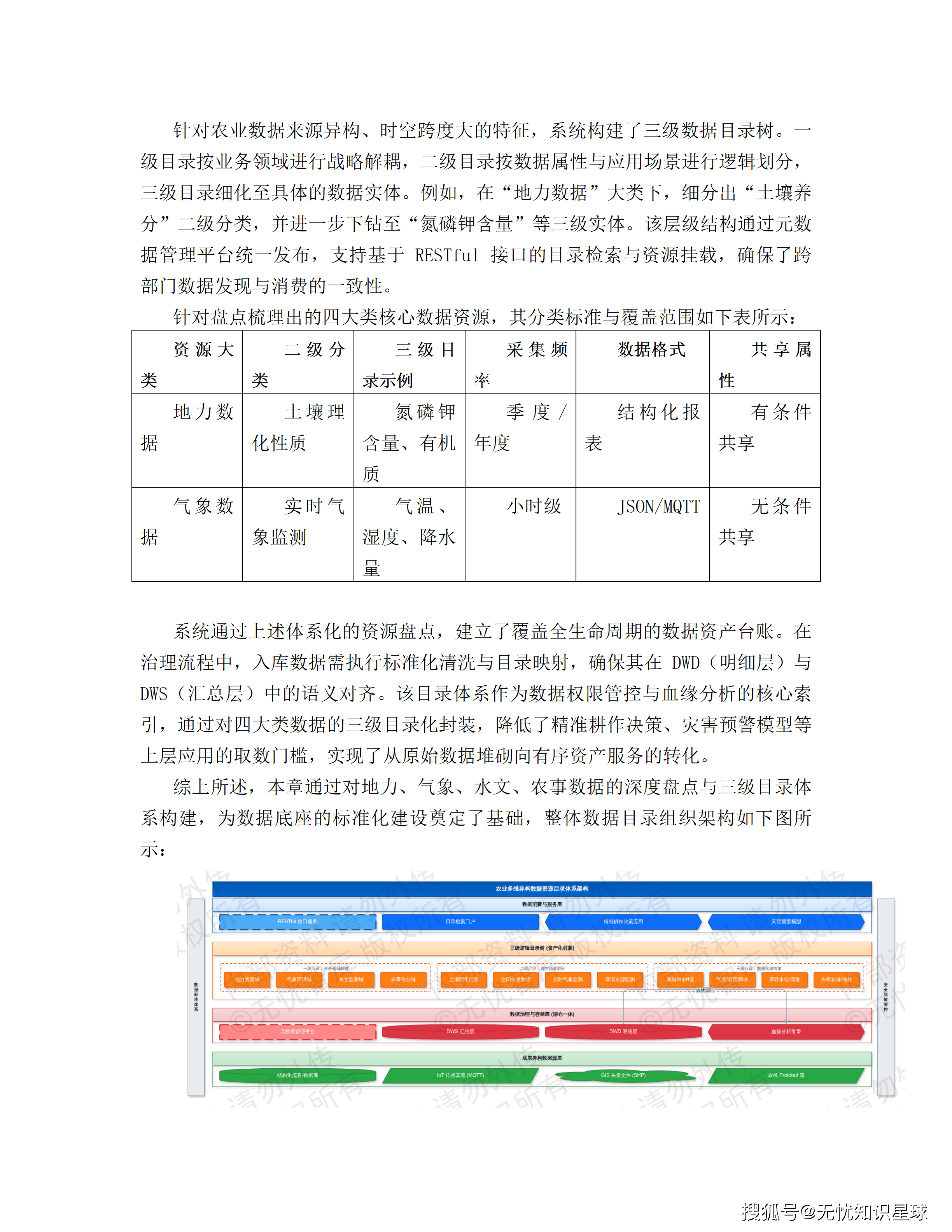 方案构建了三级数据目录树:一级按业务领域战略解耦(地力数据、气象数据、水文数据、农事数据),二级按数据属性与应用场景逻辑划分,三级细化至具体数据实体(如"地力数据→土壤理化性质→氮磷钾含量/有机质")。