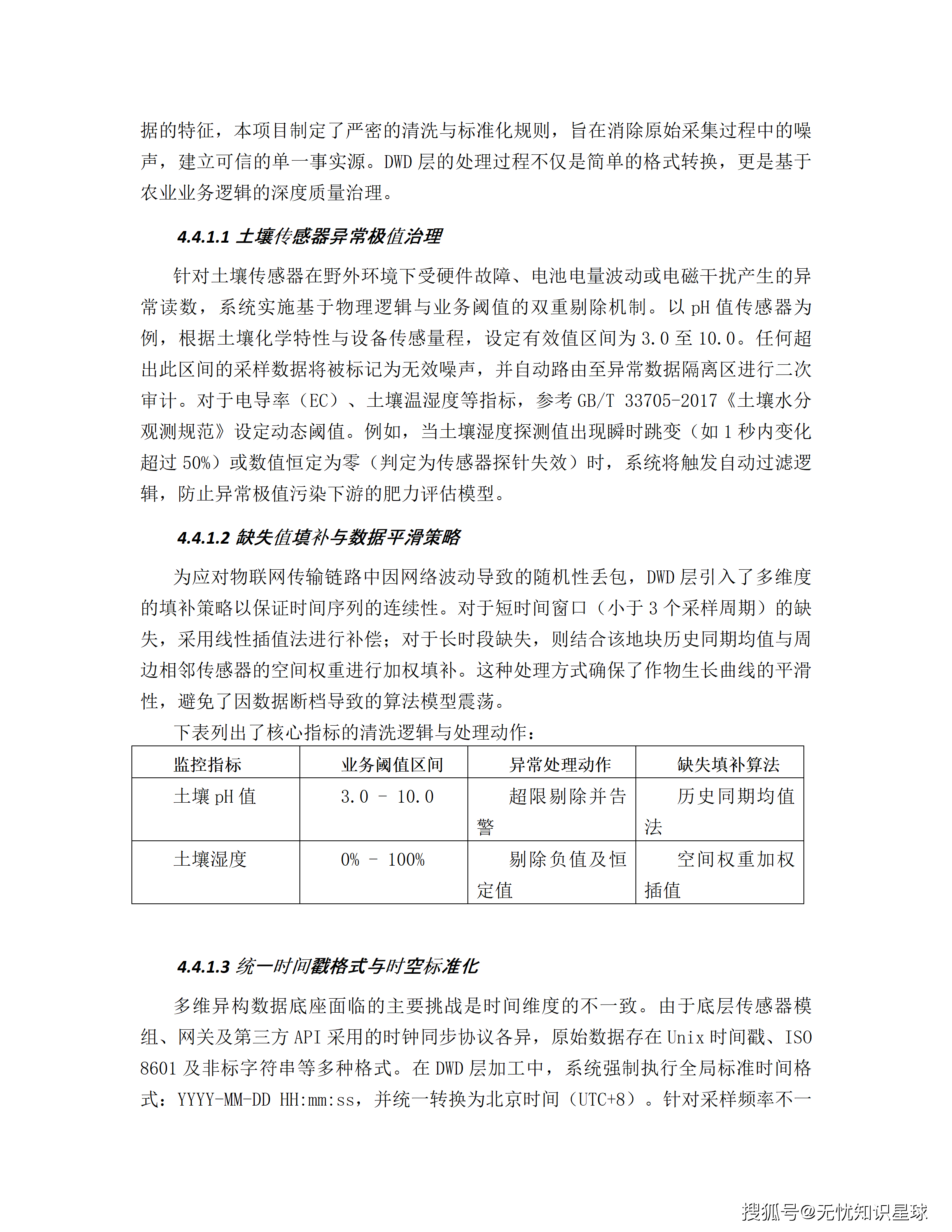 本方案将监测频率≥4次/天、模型误差≤±5%、土壤养分监测精度≥95%等质量指标作为系统验收的前置条件,这一设计优先级的排序至关重要。在许多农业信息化项目中,团队往往急于开发酷炫的可视化界面和AI预测功能,却没有为底层数据质量建立完善的校验和修复机制。结果是"垃圾数据进、垃圾决策出",AI推荐的施肥方案因为传感器数据漂移而严重偏离实际,最终导致农民对系统失去信任。