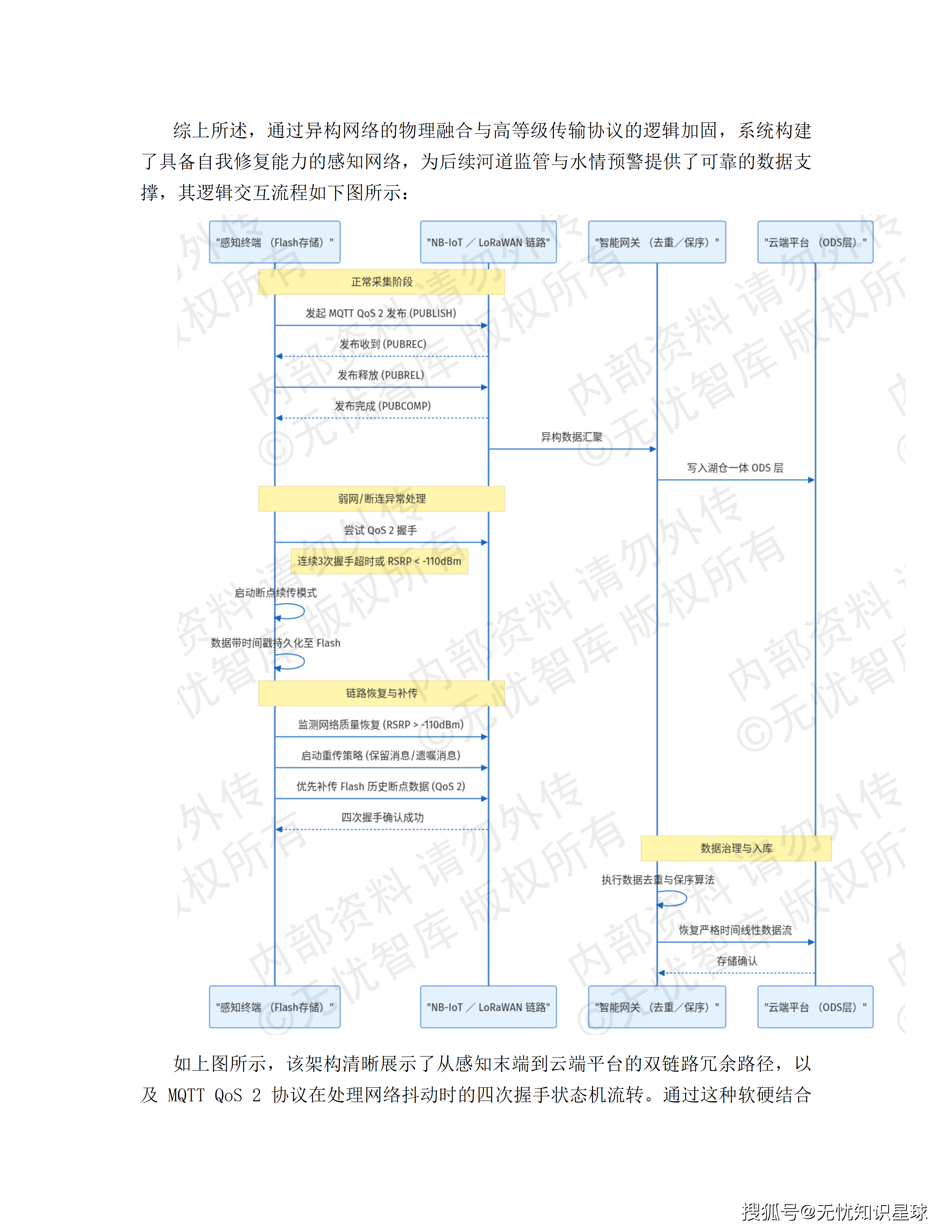 在应用层协议选择上,方案引入MQTT QoS 2(Exactly Once)服务质量等级,通过四次握手机制(PUBLISH→PUBREC→PUBREL→PUBCOMP)确保消息既不丢失也不重复,为涉河涉水合规性审计中的水位极值、偷排预警等关键指标提供强一致性保障。当无线链路中断时,感知终端内置Flash存储模块自动进入断点续传模式,支持最长7天的离线数据本地持久化存储。