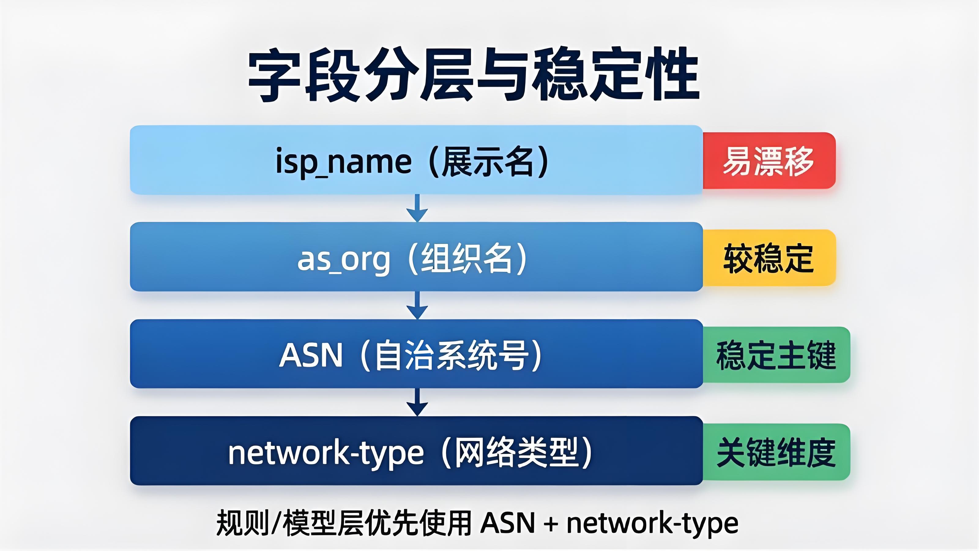 - isp_name :面向人读的字符串。会因为合并、跨境出口、供应商命名策略变化而天然不稳定。