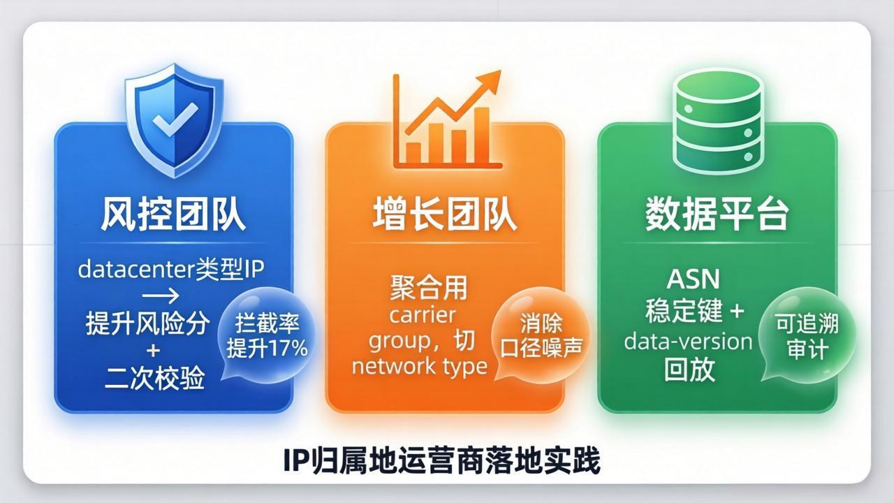 三个团队使用IP归属地运营商:风控拦截机房IP,增长归因消除噪声,数据平台用ASN聚类