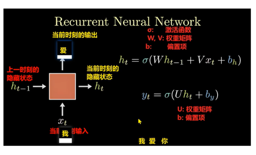之后将当前时刻的隐藏状 态当作上一时刻的隐藏状态输入 ,当前时刻的输出 作**当前时刻的输入,**得到新的输出,如此往复。
