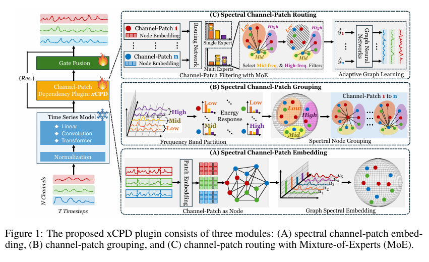 本文解析的两篇ICLR 2026论文均以此为切入点:第一篇提出PaAno,通过轻量级特征编码和记忆库机制,实现了高效的异常检测;第二篇提出xCPD,将单变量Patch视为图节点,在频域中解耦并路由通道-时间片段依赖(Channel-Patch Dependencies),显著提升了预测精度。两者分别在空间表征与频域图谱分解上展现了Patch级建模的巨大潜力。