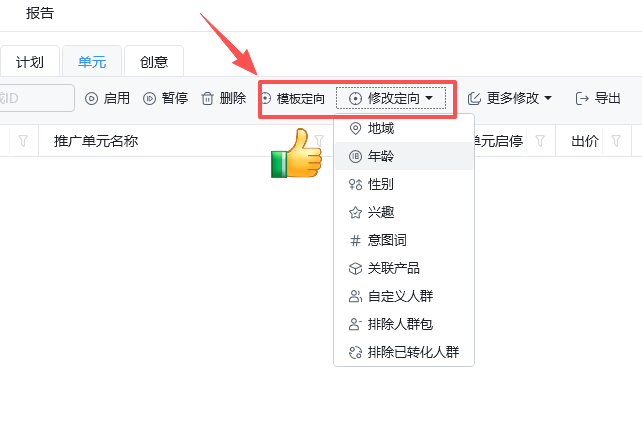 同时,对于已创建的单元,也支持单独修改定向,包括地域、年龄、性别、兴趣、意图词、排除已转化人群等,灵活适配投放过程中的优化调整。
