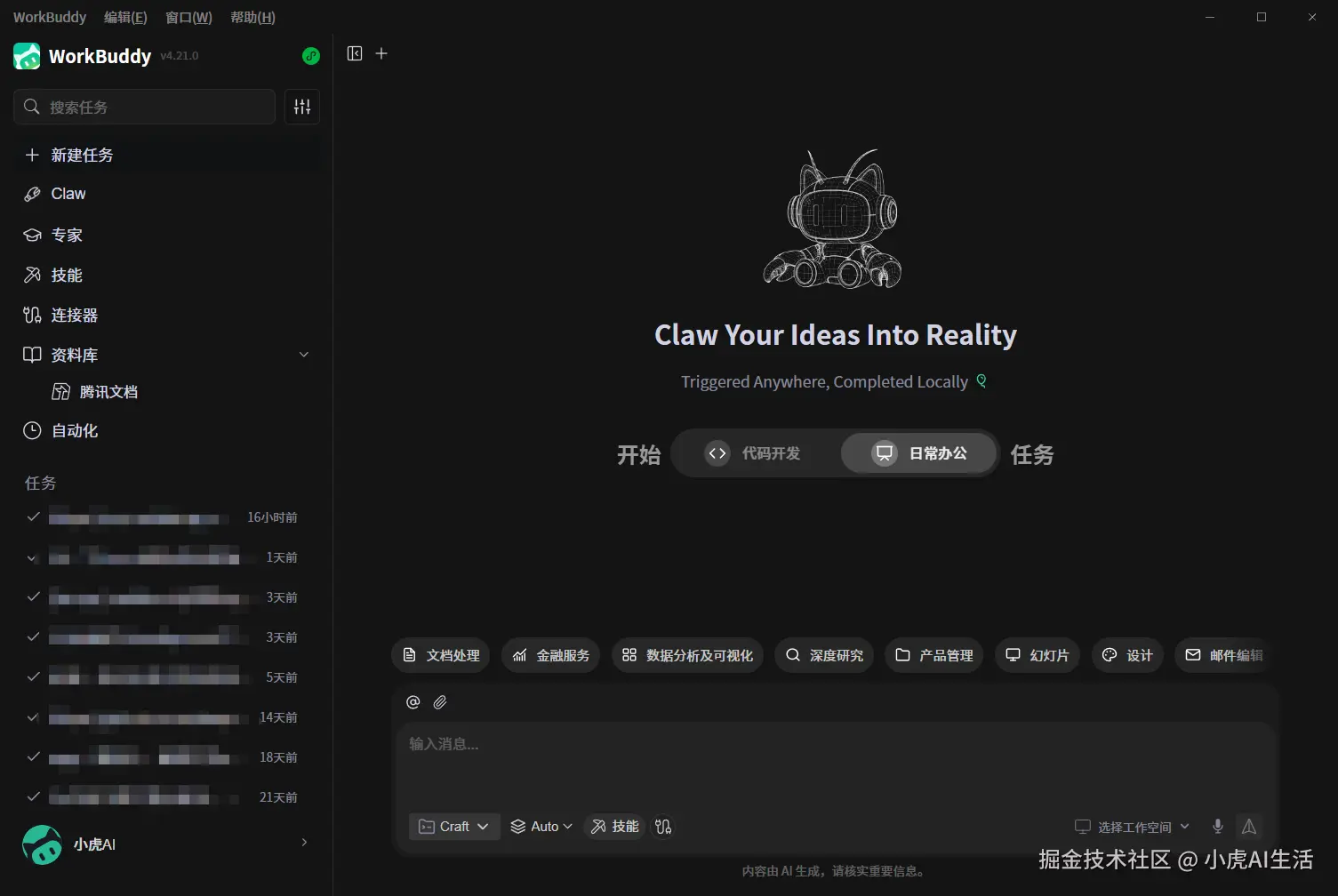 WorkBuddy 是腾讯推出的全场景职场 AI 智能体桌面工作台。