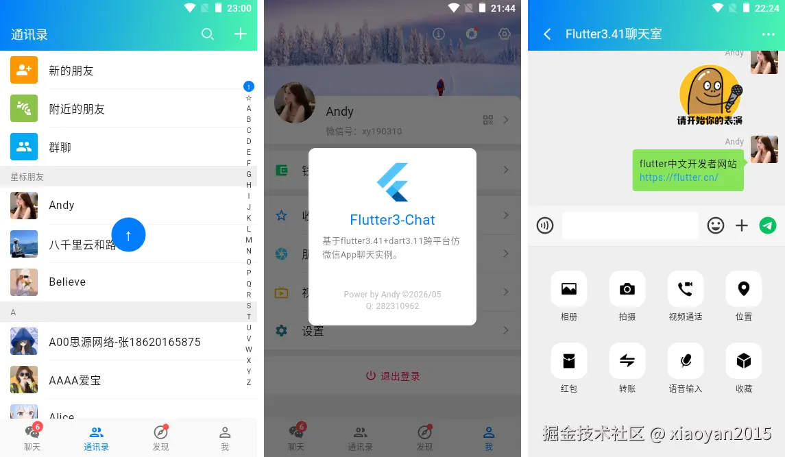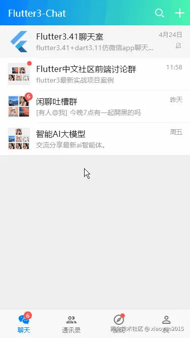 基于flutter3.41+dart3.11构建一款高质量仿微信首页+通讯录+发现+聊天详情app程序。