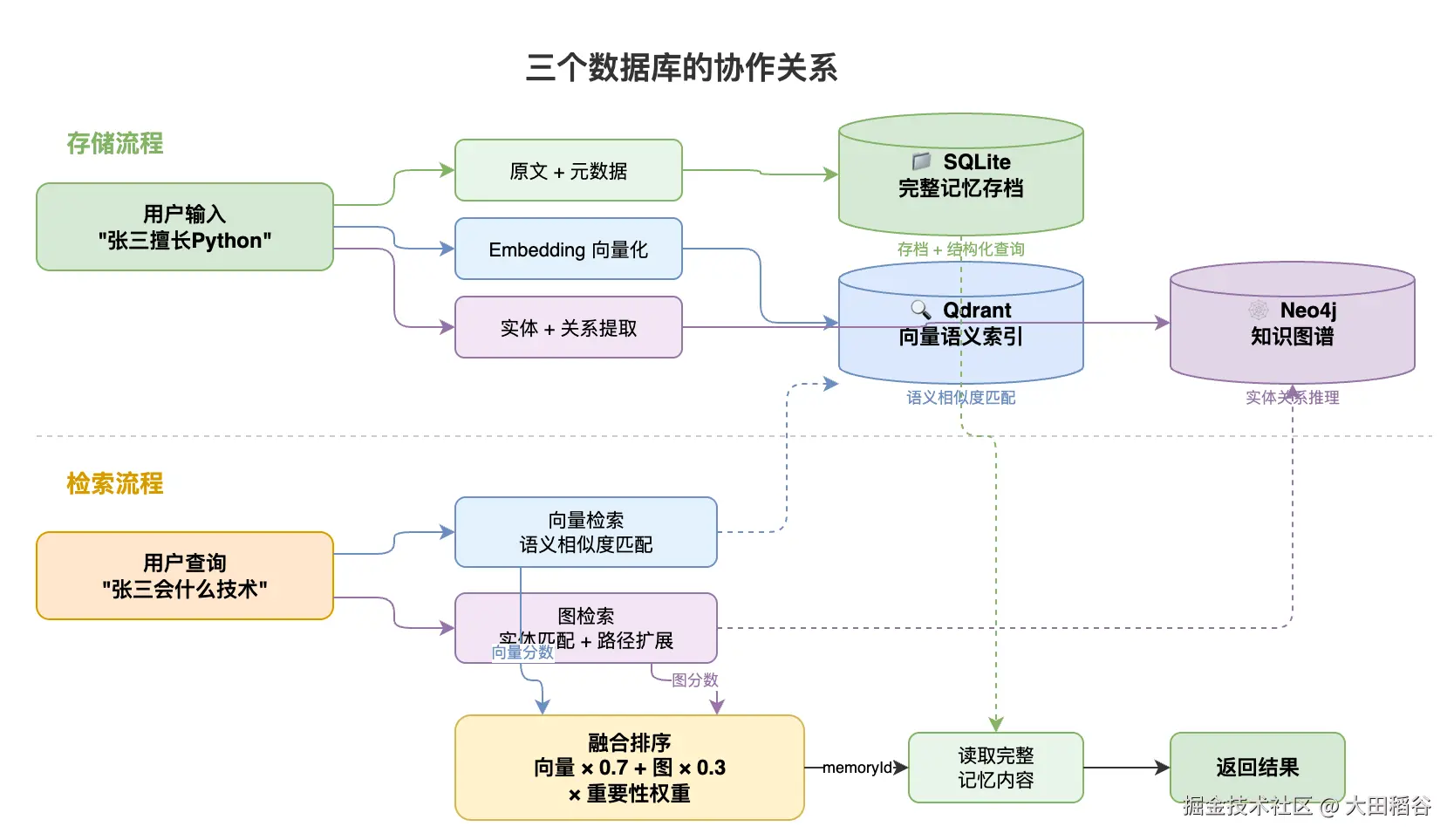 | 记忆检索 | 向量相似度 + 图遍历 + 融合排序 |
