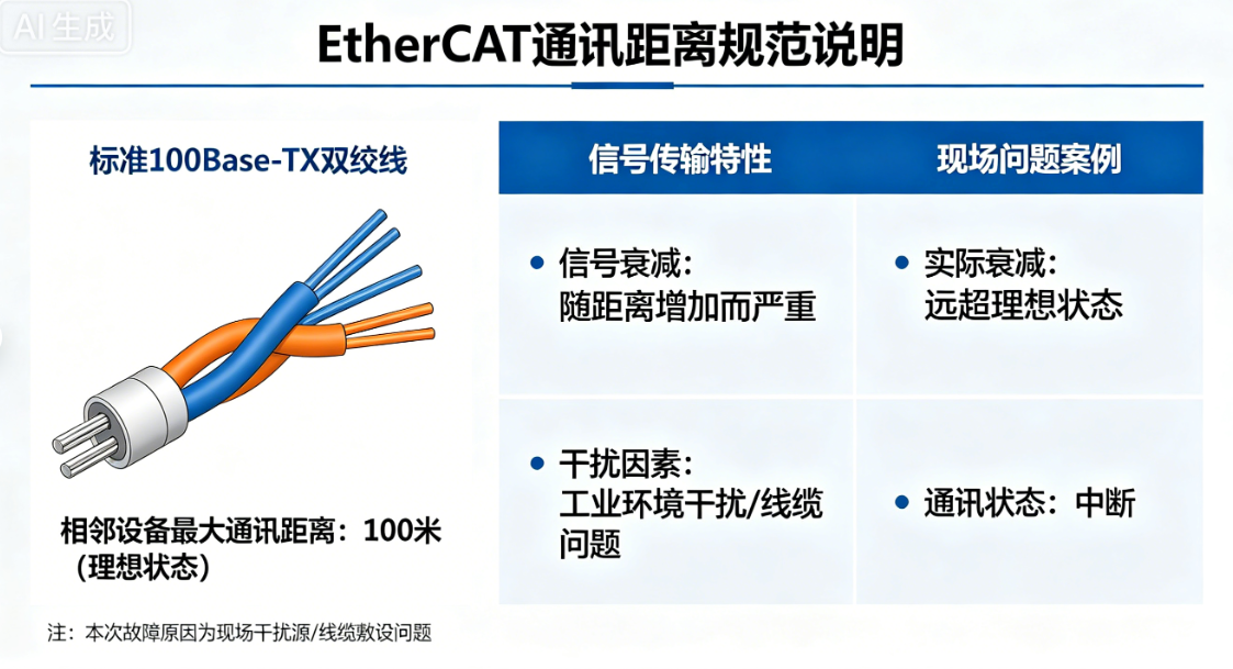 首先,明确EtherCAT通讯距离规范。采用标准100Base - TX双绞线时,相邻设备最大通讯距离为100米,这基于以太网信号传输特性,信号在双绞线中传输会衰减、受干扰,距离越长信号衰减越严重,现场工业环境干扰及线缆问题会使实际信号衰减远超理想状态,导致通讯中断。 本次虽距离未超上限,但因现场有干扰源、线缆敷设问题,导致信号衰减远超理想状态,通讯中断。