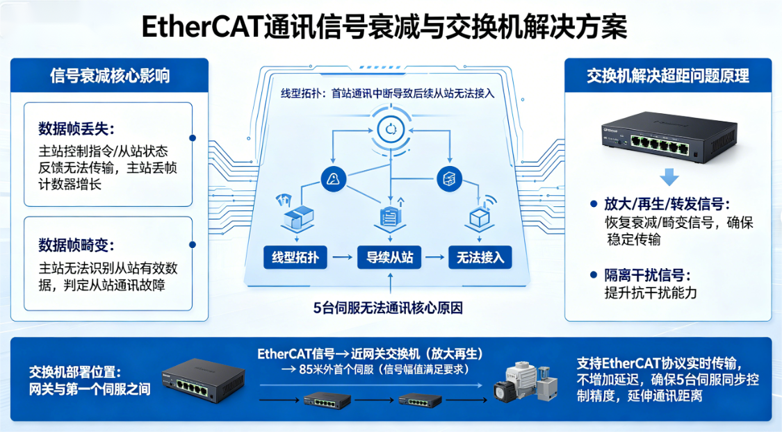 Profinet转EtherCAT网关在EtherCAT侧作主站带动5台伺服驱动器,因与第一个伺服驱动器物理距离达85米,初始部署后无法正常通讯,PLC显示"EtherCAT从站通讯故障",后续4台伺服也无法接入网络。经排查,故障源于EtherCAT通讯距离超规范。加装工业以太网交换机解决了该问题,原理从三方面说明: