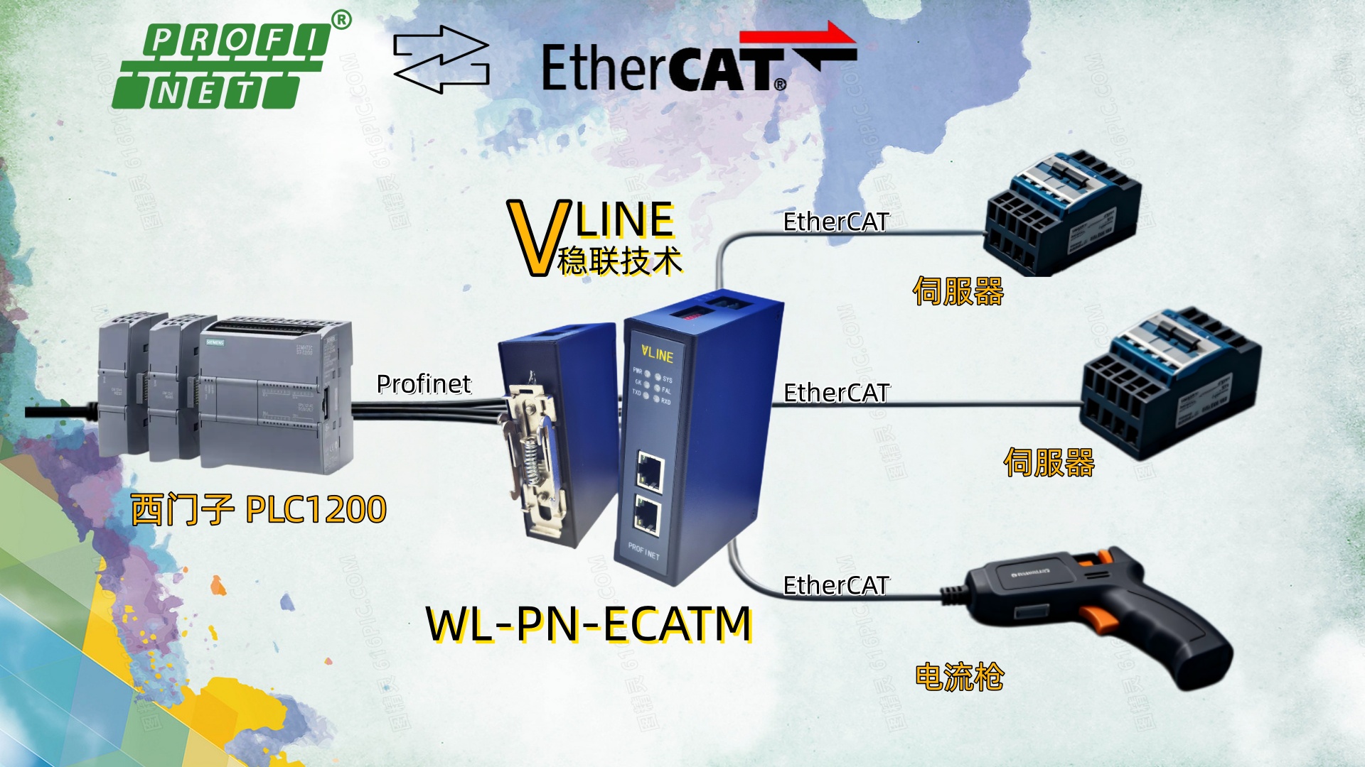 在工业自动化控制系统中,Profinet与EtherCAT协议优势显著,Profinet多用于PLC与上位机、网关等组网通讯,EtherCAT因高实时性和高同步性,是伺服驱动器等设备首选。本次应用用Profinet转EtherCAT网关作通讯枢纽,实现西门子PLC与5台伺服驱动器、1台电流枪互联互通。核心通讯架构为:西门子PLC(Profinet主站)→ 网关(Profinet转EtherCAT)→ 5台伺服驱动器(EtherCAT从站)+ 1台电流枪(EtherCAT从站),网关承担协议转换等功能,实现全系统闭环控制。