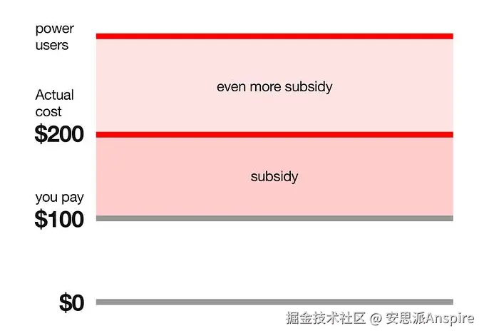 问题在于,几乎所有前沿科技产品都享受补贴。你每月100美元的套餐,实际上要让公司损失150到200美元。他们想让你过度依赖这项技术,最终让你为了继续使用而支付更多费用,甚至可能高达1000美元。