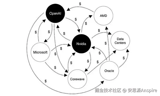 苹果公司也是极少数不在如今臭名昭著的"人工智能循环经济"图表中的公司之一。这意味着A公司支付B公司10亿美元,然后B公司再支付A公司10亿美元(返还)。尽管实际上并没有发生任何交易,但经济体系中却出现了20亿美元的流通。