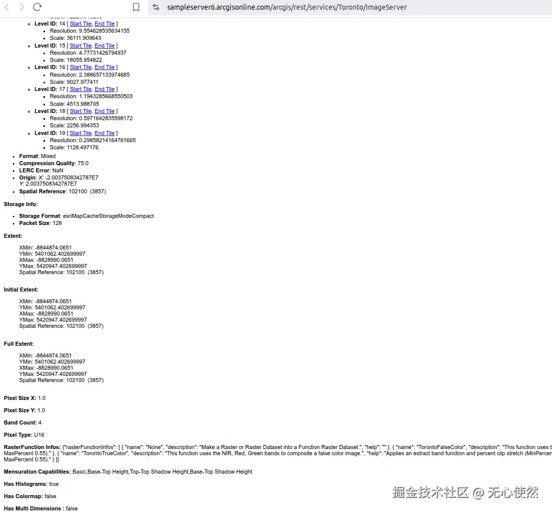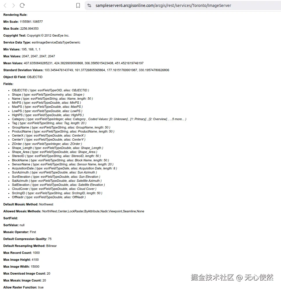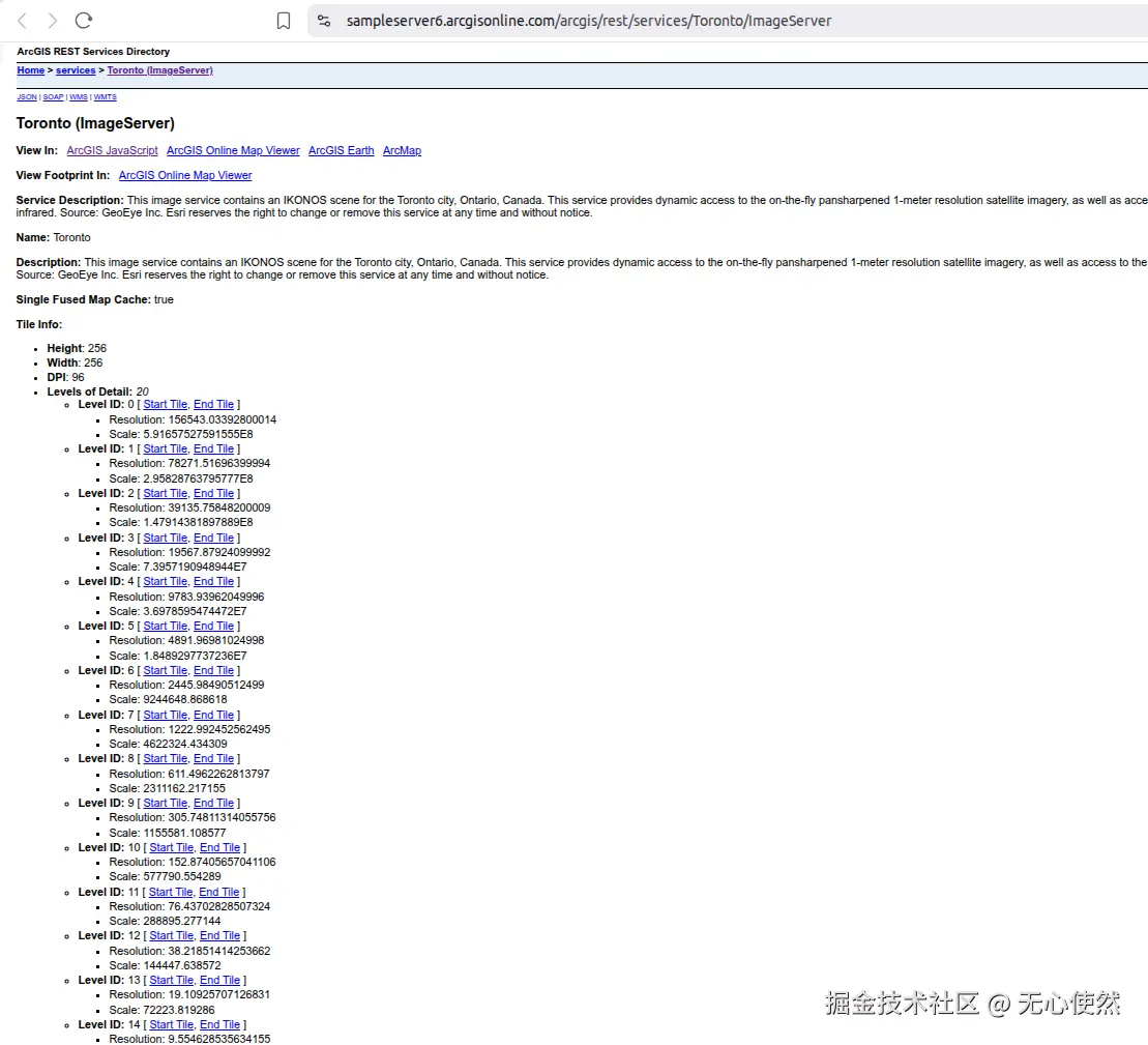 影像服务是一种通过Web服务提供对栅格数据和影像数据访问的能力。它允许用户通过互联网高效地存储、管理、处理、分析和显示大规模影像数据集合,包括卫星影像、无人机影像、航空摄影、天气雷达数据等。简单来说,影像服务就是将大量的影像数据(如某个地区多年的卫星图)发布成一个统一的、可通过网络访问的图层,用户无需下载原始数据,即可在浏览器或桌面应用中查看、分析和处理这些影像。下面使用ArcGis官方服务作为示例直接调用(如果使用自己的私有服务,可能先要获取token)