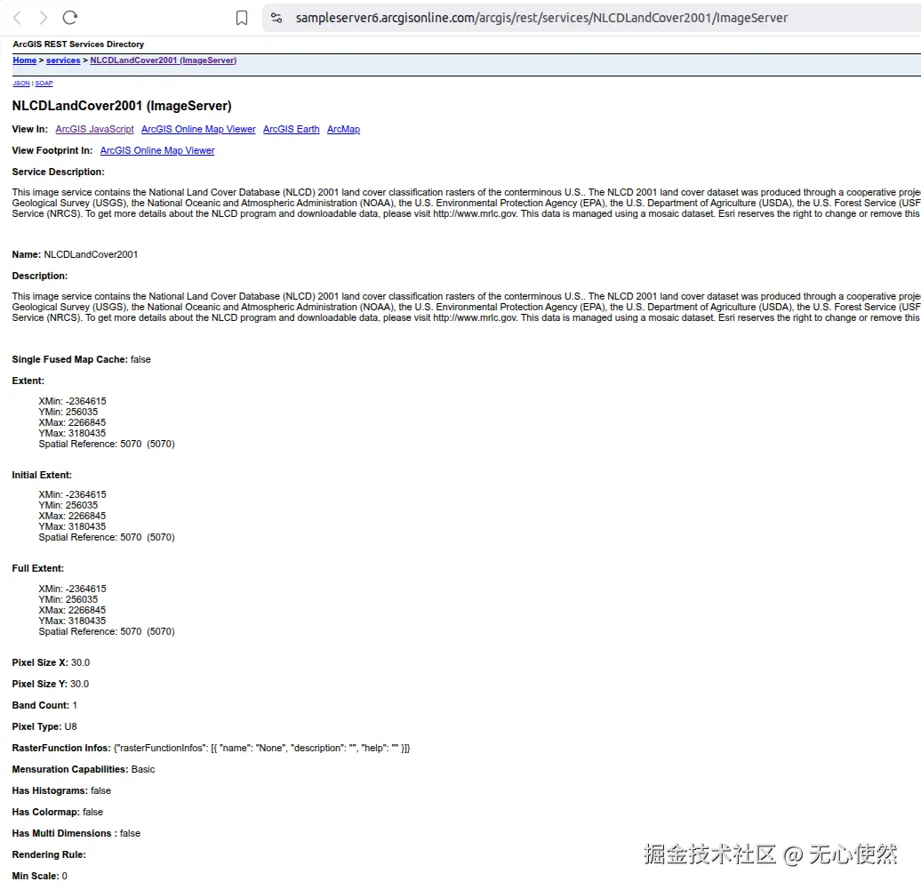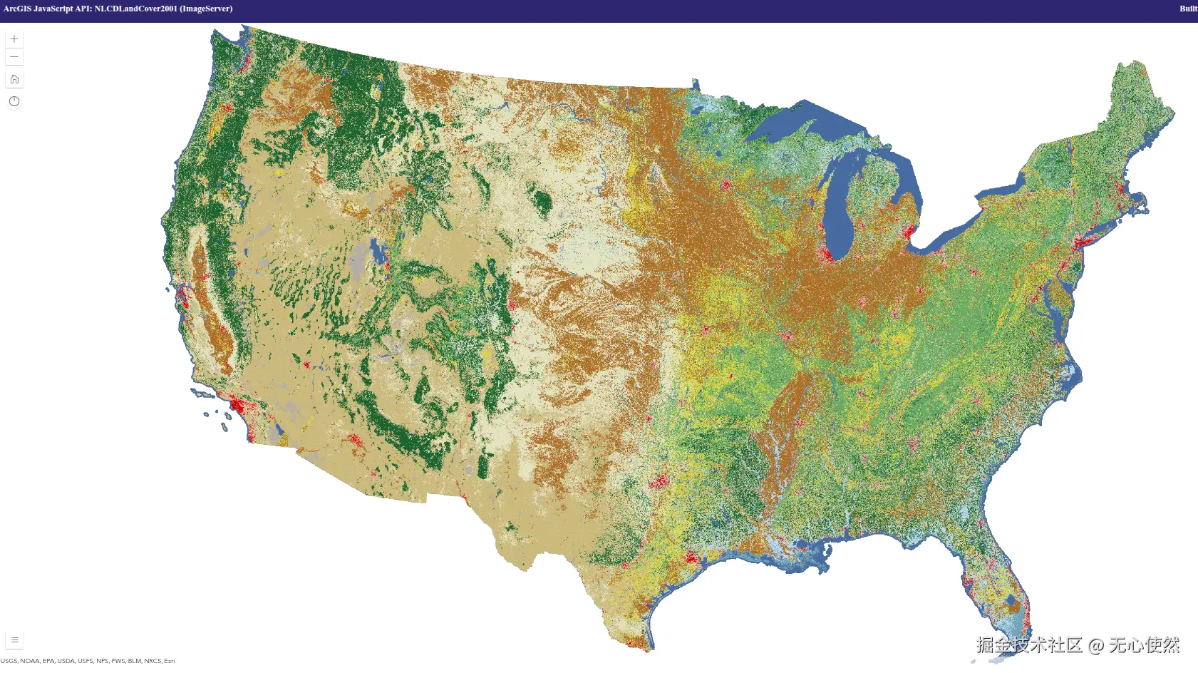 <p><strong>NLCD 服务:</strong> 使用 ImageArcGISRest 源动态加载影像</p>