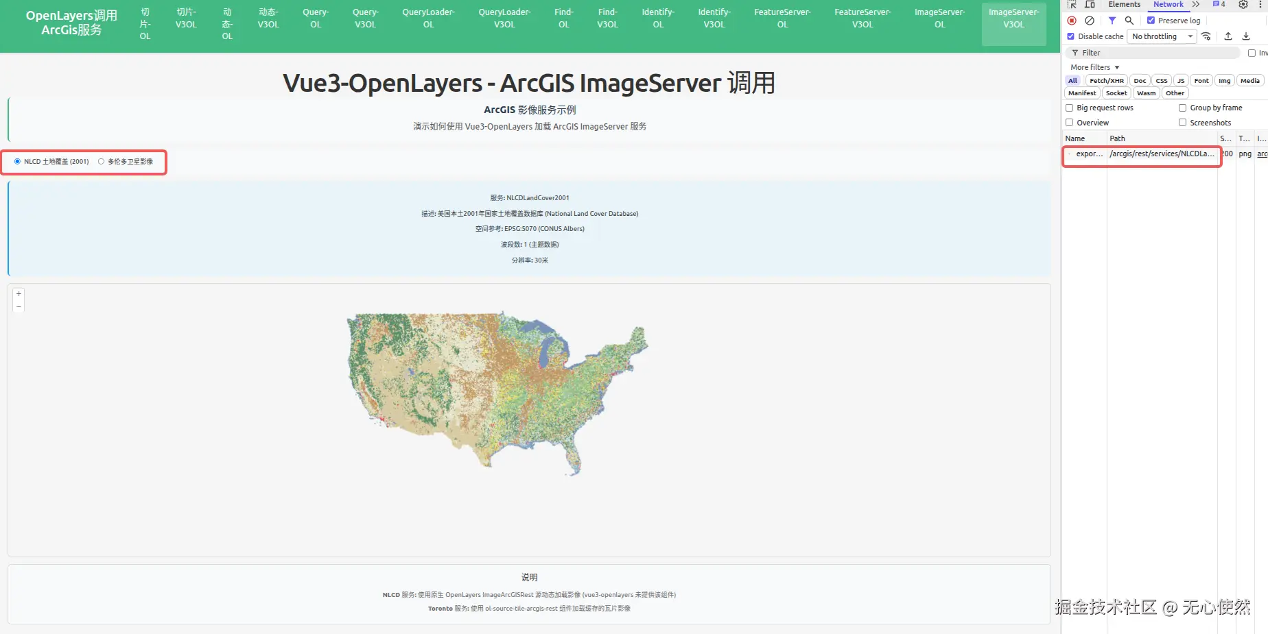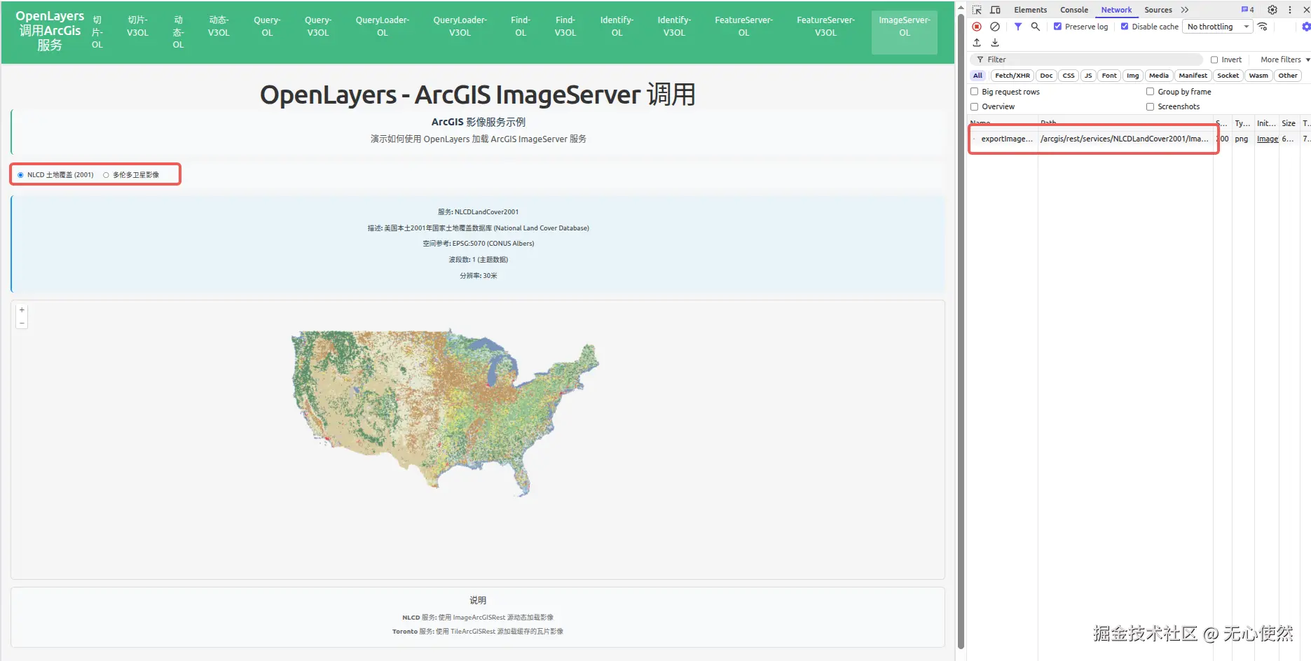 <strong>NLCD 服务:</strong> 使用原生 OpenLayers ImageArcGISRest