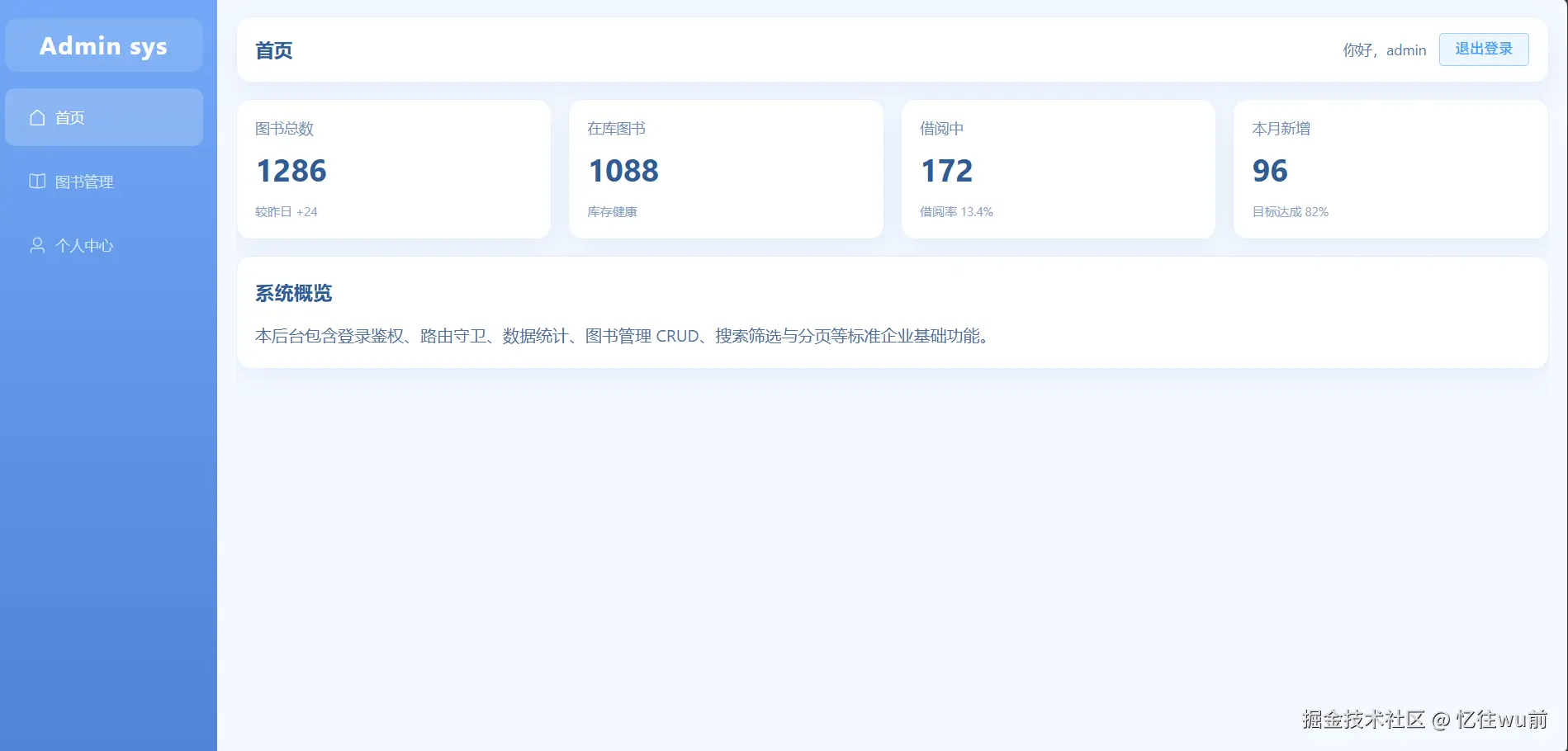 项目遵循先页面骨架、后业务逻辑、最后底层架构的开发思路,依次完成登录、布局、首页、图书管理、个人中心页面搭建;实现图书查询、筛选、分页、增删改查全业务,以及个人信息编辑、表单校验等功能;再配合 Pinia 状态管理 和 Vue Router 路由守卫,实现登录持久化、路由权限拦截,整套系统业务流程完全闭环。