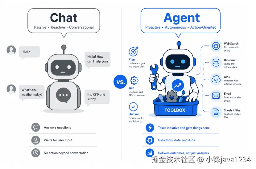 - 它与普通聊天的核心差别,往往不在「会不会说人话」,而在 有没有闭环:想---做---看结果---再决定。