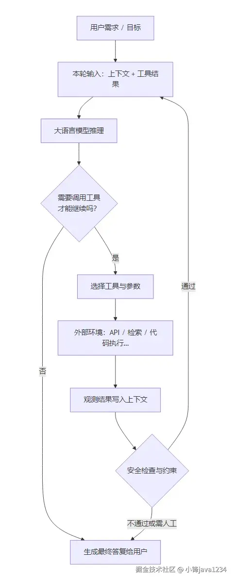 这张图刻意保留了 「循环」 :只要任务没完成且仍允许调用工具,就会再回到模型推理。现实系统还会加:最大步数、预算、权限、人机确认,避免无限循环或不安全操作------那是工程上的护栏,不改变「Agent」这条主线的概念形状。