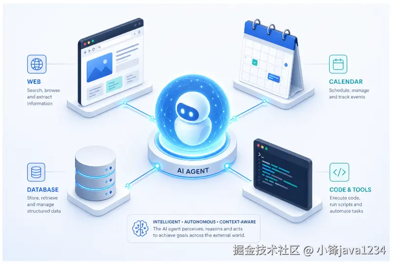 如果你最近刷技术社区、产品发布会或招聘 JD,多半见过 Agent 这个词。中文里有人译成「智能体」,也有人直接说「代理」------听起来像科幻片里的角色,其实讨论的大都是同一件事:让大语言模型(LLM)不只是「接一句回一句」,而是能在多步操作里自己拿主意、调工具、改计划,最终完成一个目标。