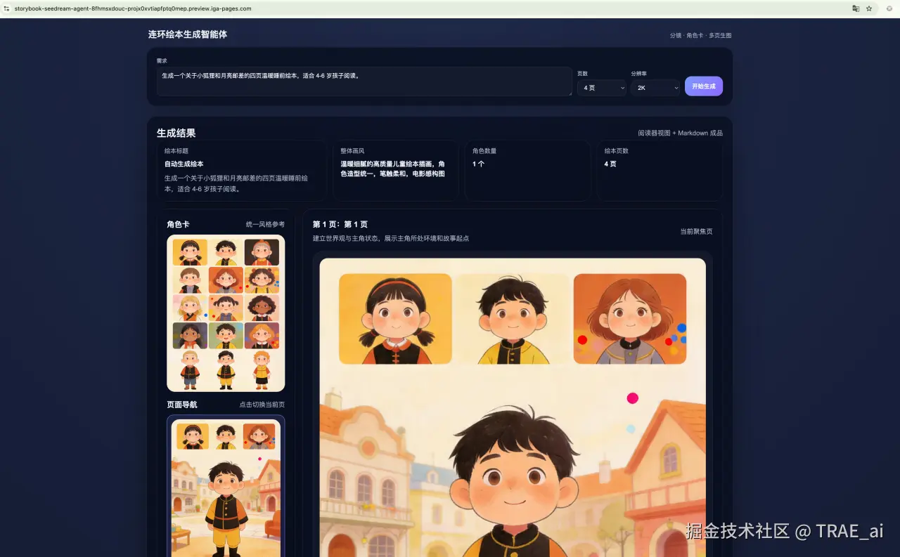 打开部署返回的预览 URL,输入一段绘本需求,验证分镜拆分、风格卡片生成、多页出图三段链路是否正常