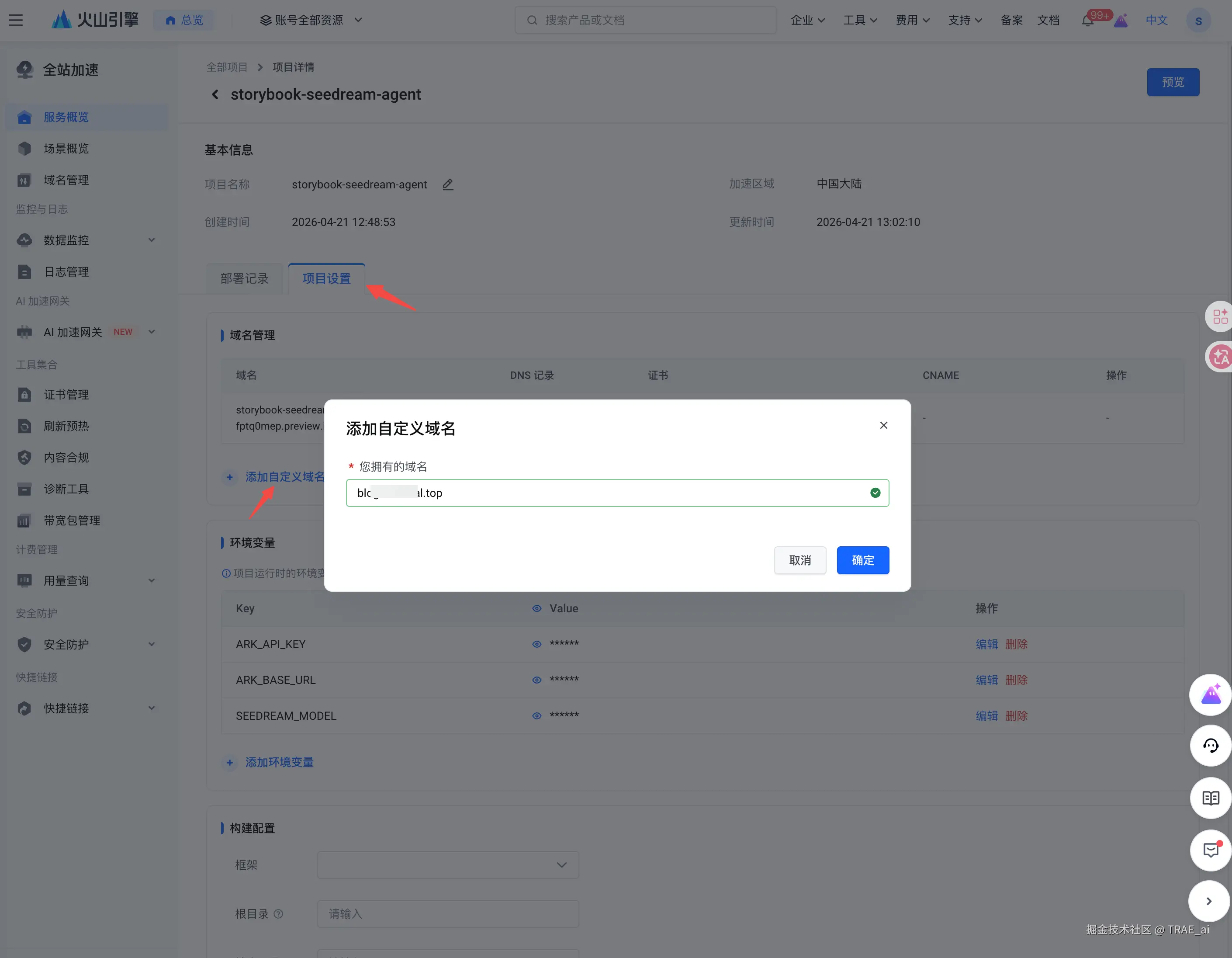 进入火山引擎控制台 → 全站加速 → Pages → 选择你的项目 → 项目设置 → 环境变量。