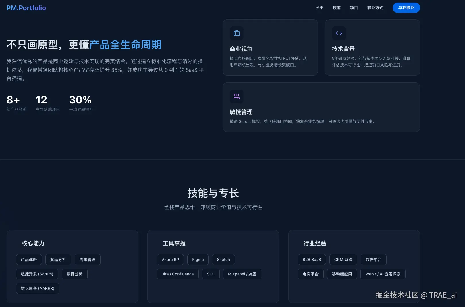 帮我生成一个产品经理的个人主页。深色模式,现代简约风。需要包含个人简介、过往项目(以卡片形式展示,含标题、简介、链接)、技能标签和联系方式。使用 React 和 Tailwind CSS。
