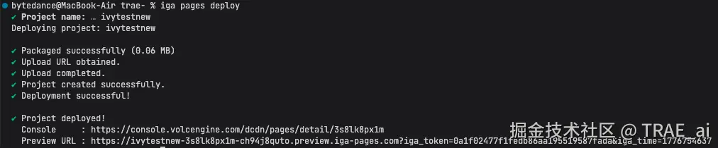 对预览效果满意后,在 TRAE 的集成终端里,执行部署操作:
