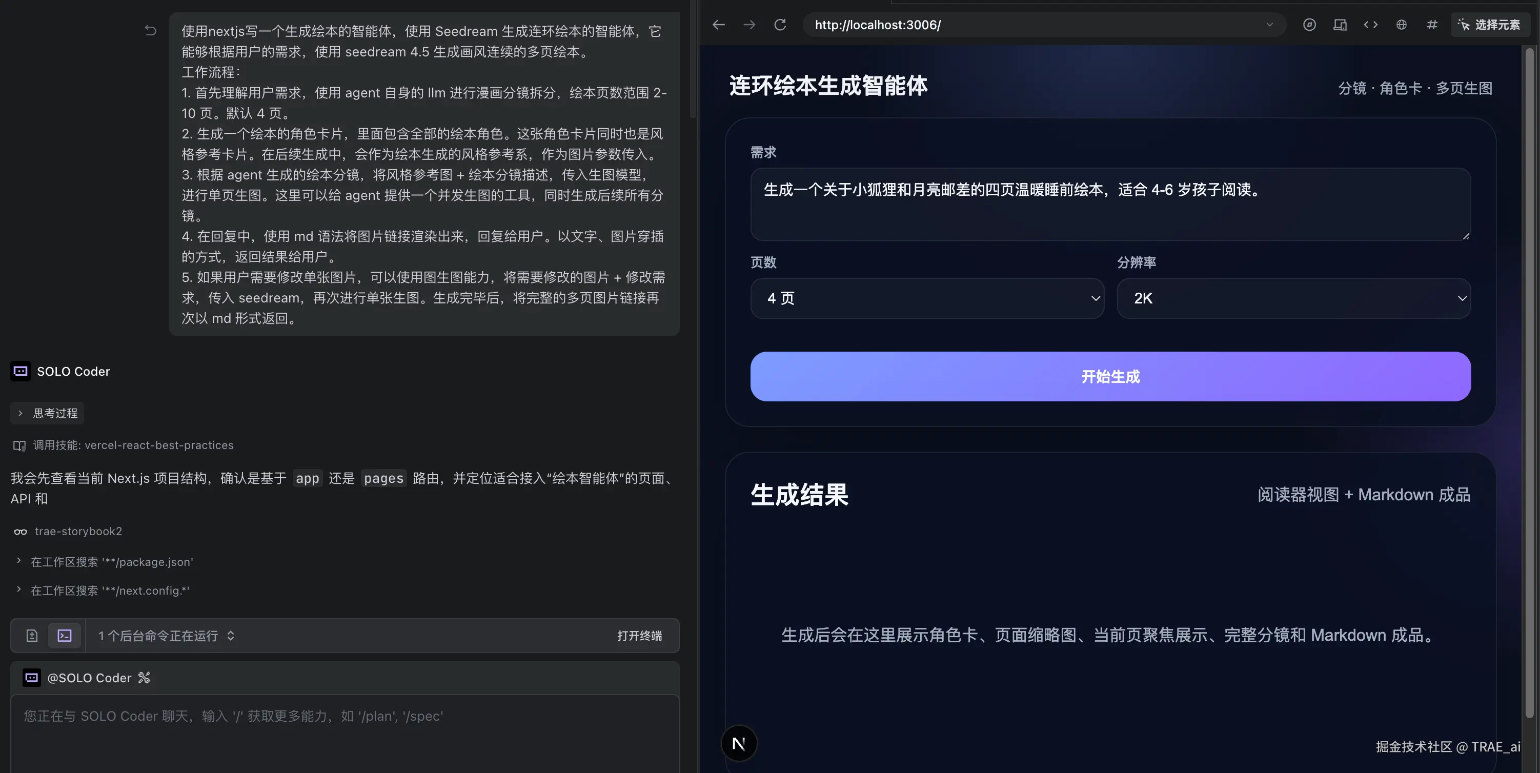 使用nextjs写一个生成绘本的智能体,使用 Seedream 生成连环绘本的智能体,它能够根据用户的需求,使用 seedream 4.5 生成画风连续的多页绘本。