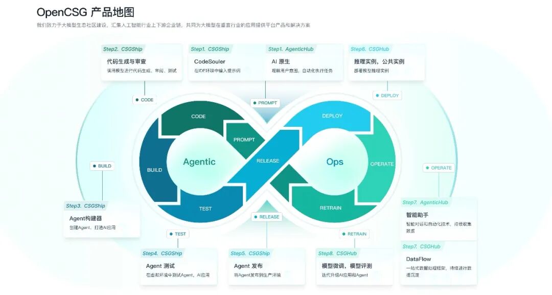 开放东方社区依托全球领先的开源AI平台OpenCSG,构建面向未来的企业级AI操作系统。OpenCSG提出AgenticOps方法论,该方法论覆盖企业AI智能体的开发、部署、运行和迭代全过程,实现AI从单纯工具向持续生产力系统的转化。基于AgenticOps方法论,社区形成了两大核心产品:AgenticHub作为OPC的AI原生开发与运行平台,通过自然语言驱动整个闭环,实现企业与城市智能体的端到端管理,为各行业提供全栈AI解决方案;**CSGHub则承担AI资产管理与运营核心职责,实现模型、数据与资产的持续沉淀,为社区生态的长期发展提供支撑。