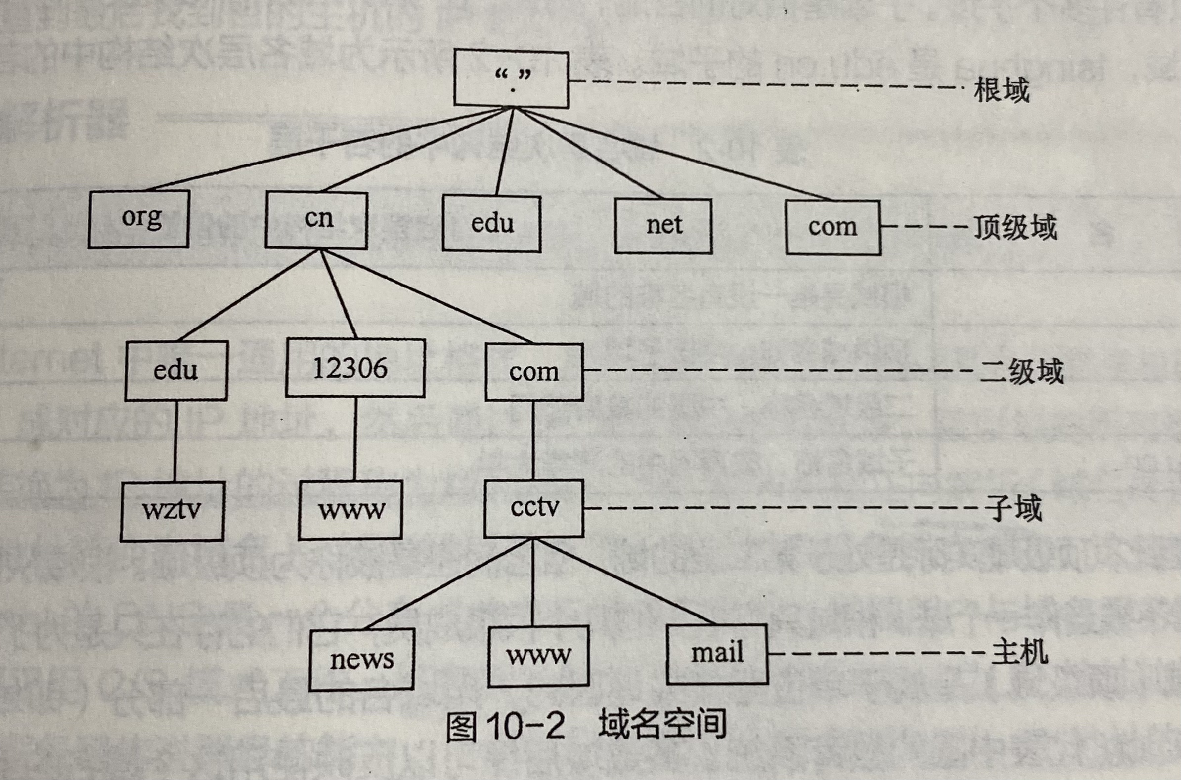 回到技术本身,"域名空间"是指整个 DNS 的命名结构,它呈现为一棵层次式树状结构(如教材图 10-2 所示)。