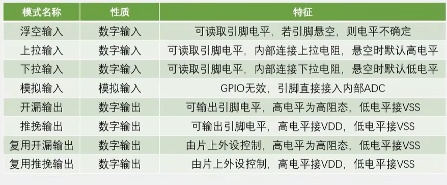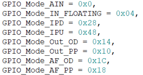 从上到下依次是:模拟输入、浮空输入、下拉输入、上拉输入、开漏输出、推挽输出、复用开漏、复用推挽