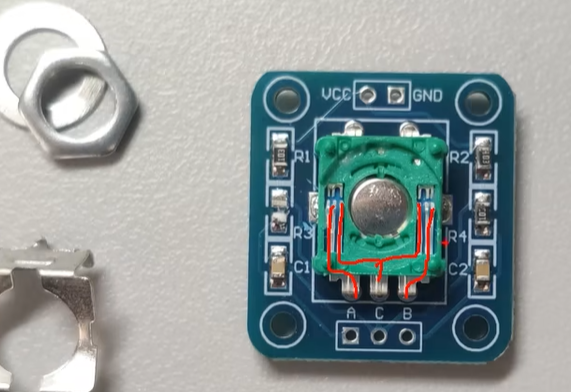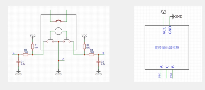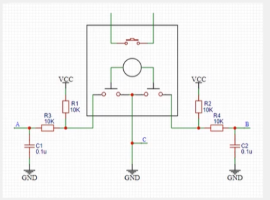 上面按键悬空,在圆形模块下方是编码器触点,旋转轴旋转时,这两个触点以相位相差90度的方式交替导通,而且要配合外围电路才能输出高低电平,在10k上拉电阻默认没旋转的情况下,这个点被上拉为高电平,通过R3这个电阻输出到A端口的也就是高电平,当旋转时,内部触点导通,那这个点就直接被拉低到GND了,在通过R3输出,A端口就是低电平了,R3时输出限流电阻,它是为了防止模块引脚电流过大的,C1是输出滤波电容,可以防止一些输出信号抖动,右边同理