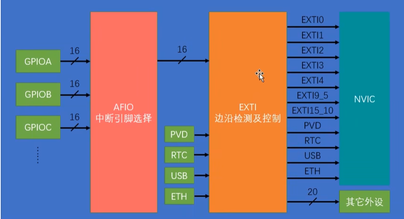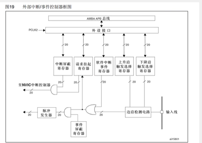 2.触发事件:事件屏蔽寄存器进行开关控制,最后通过一个脉冲发生器,到其他外设,这个脉冲发射器就是给一个电平脉冲,用来触发其他外设的动作