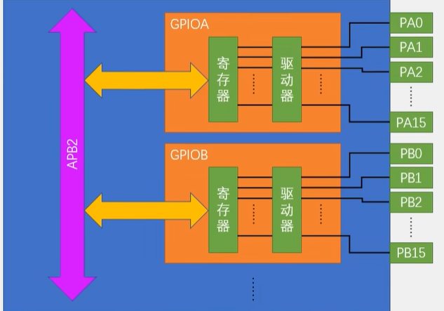 2.在每个模块内,都有寄存器和驱动器,内核可以通过APB2总线对寄存器进行读写,以此完成输出和读取电平的功能(寄存器的每一位对应一个引脚,输出寄存器写1,对应引脚输出高电平,写0,就输出低电平,输入寄存器读取为1,证明对应端口目前是高电平,读取为0,就是低电平)