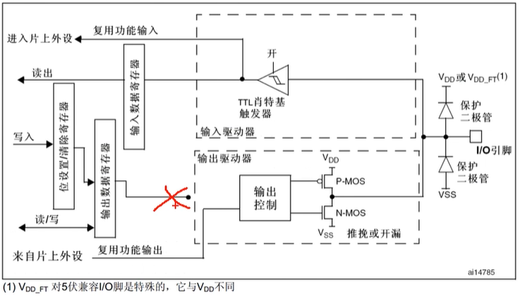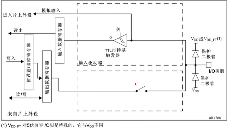 2.复用功能输入:连接到其他需要读取端口的外设上,如串口的输入引脚,因为这根线接收的是数字量,所以在施密特触发器后面