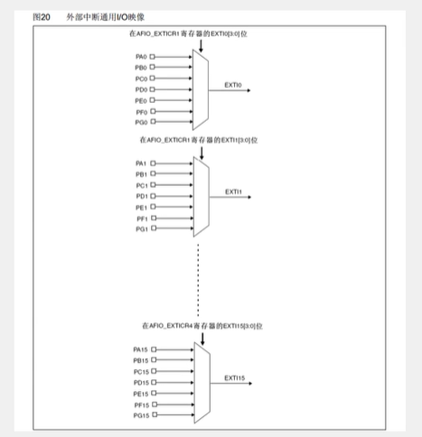 5.void GPIO_EXTILineConfig(uint8_t GPIO_PortSource, uint8_t GPIO_PinSource);:调用此函数,就可以配置AFIO的数据选择器,来选择我们想要的中断引脚