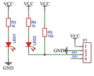 3.指示灯:左边的是电源指示灯,通电就亮,右边的是DO输出指示灯,它可以指示DO的输出电平(低电平点亮,高电平熄灭),上拉电阻R5是为了保证默认输出为高电平的