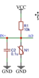 1.AO电压由来:在上图中,N1代表传感器元件所代表的可变电阻,它的阻值可以根据环境的管线,温度等模拟量进行变化,R1是和N1进行分压的定值电阻,它和N1串联,一端接在VCC正极,一端接在GND负极,C2为滤波电容,它是为了给中间的电压输出进行滤波的,用来滤除一些干扰,保证输出电压波形的平滑,一般遇到这种一端接在电路中,另一端接地的电容,都可以考虑一下是不是滤波电容的作用,如果是滤波电容的作用,那这个电容就是用来保证电路稳定的,并不是电路的主要框架,这是我们在分析电路时,就可以先把这个电容给抹掉,这样就可以使我们的电路分析更加简单,当N1阻值变小使,下拉作用会增强,中间的AO端电压就会降低,当N1阻值为0,AO输出被完全下拉,输出0伏,当N1阻值变大,下拉作用就会减弱,中间的引脚由于R1的上拉作用,电压就会升高,当N1阻值趋向正无穷,电路无限趋近于于断路,输出电压被R1无限拉高至VCC